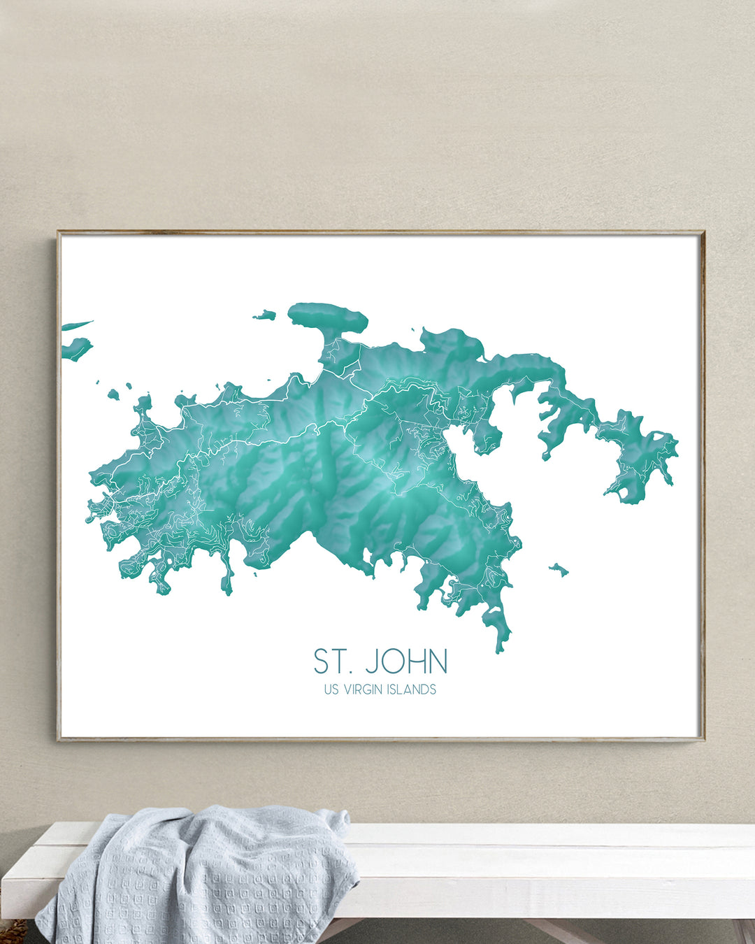 Original price $ 28.00 CAD - Original price $ 307.00 CADOriginal price$ 28.00 CAD - $ 307.00 CAD$ 28.00 CAD - $ 307.00 CADCurrent price $ 28.00 CADSt John, US Virgin Islands map print poster that includes: 3D contour landscape features and a watercolour style water design in pale blue colours...