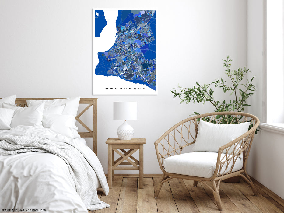 Discover the beauty of Anchorage, Alaska with our modern and interesting map art print. From city streets to water features and thousands of blue shapes, this uniquely detailed design will be a standout addition to your home or office. Available in various sizes, celebrate your love for Anchorage in style.