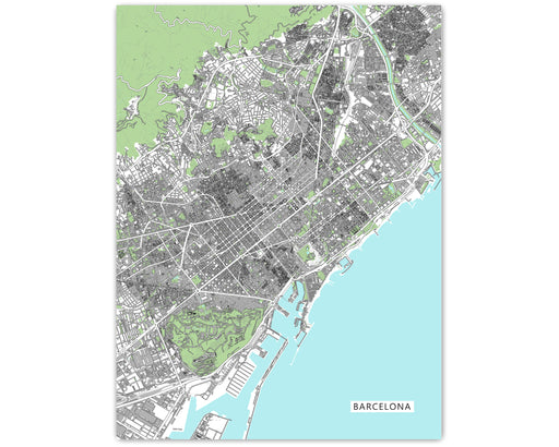 Barcelona Map Wall Art Print Poster with Buildings, Modern Spain City Road Maps