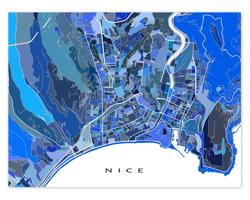 Nice France Map Wall Art Print Poster, Blue Geometric French Europe City Street Road Maps