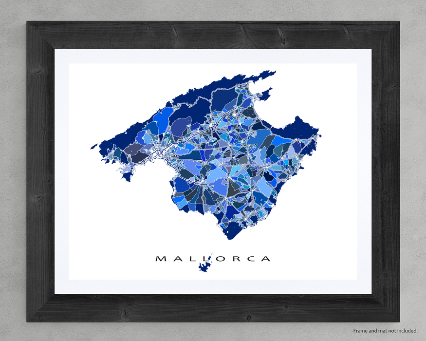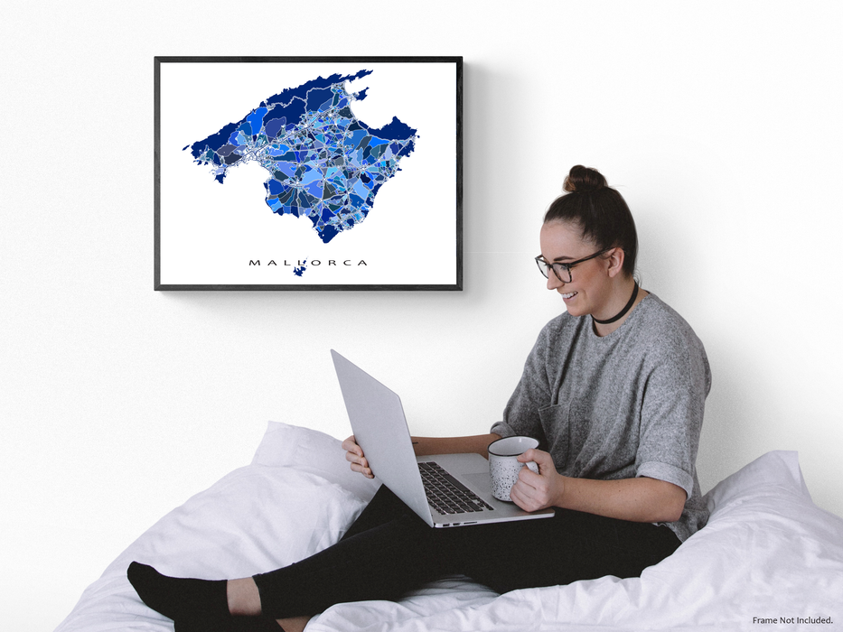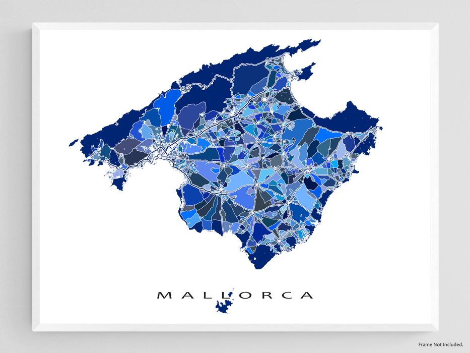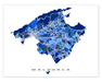 This Mallorca map print features a unique design with intricate island roads and tiny blue shapes, showcasing the beautiful Majorca or Mallorca, Spain. It includes the main towns of Palma and Manacor and will add a modern and interesting touch to any living or office space. Show off your love for Mallorca with this eye-catching wall print, available in multiple sizes from print to large poster.