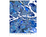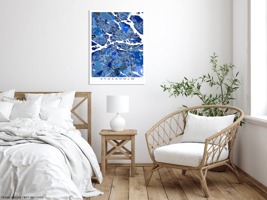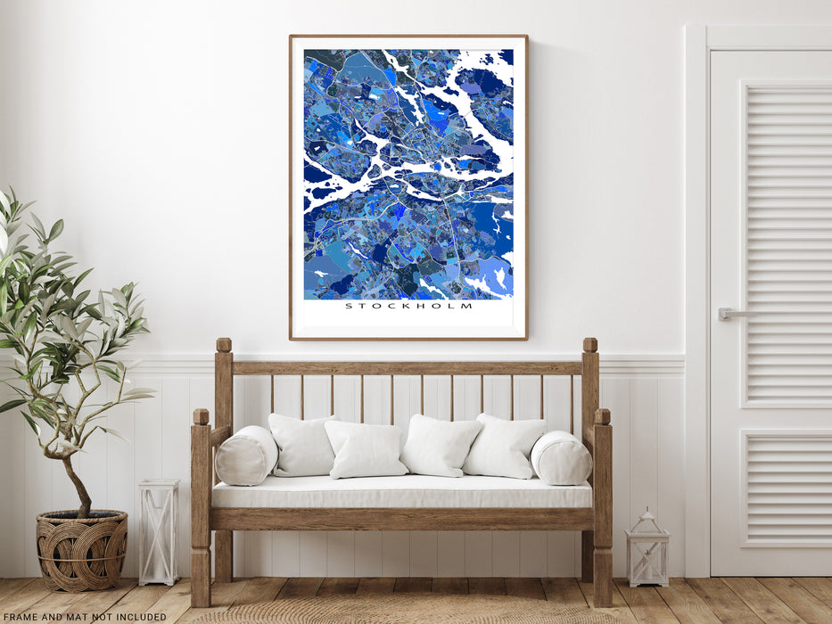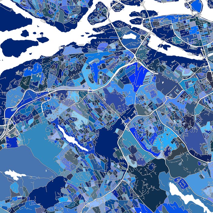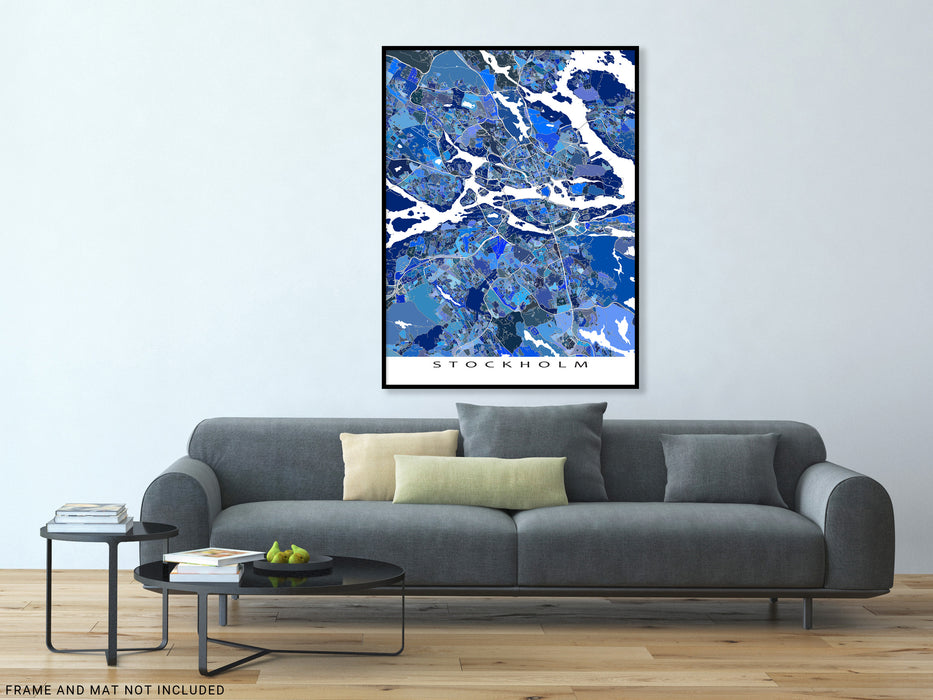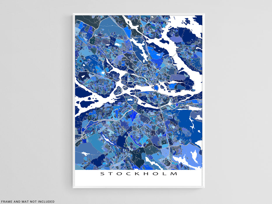 Celebrate your love of Stockholm, Sweden with this modern and interesting map art print poster. Its intricate geometric design of city streets, water features, and blue shapes captures the uniqueness of the city.