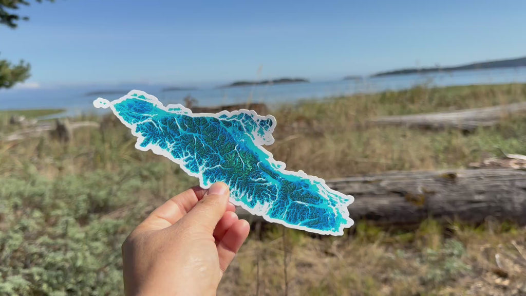Celebrate Vancouver Island with this lively blue and green topographic map sticker! It highlights the island’s lush green mountains, valleys, and the deep blue ocean in bright, eye-catching detail that looks fantastic on your car, even from far away.