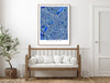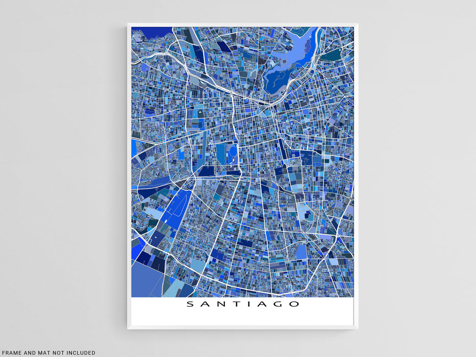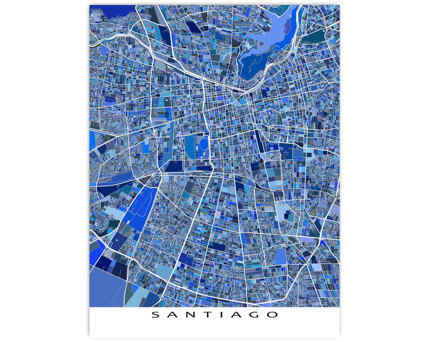 Discover the beauty of Santiago, Chile with this modern and intriguing map art print poster. Featuring city streets, water features, and thousands of blue shapes, this uniquely detailed design will add a noticeable touch to your living spaces and office. Celebrate your love for Santiago with this map, available in various sizes from small print to large poster.
