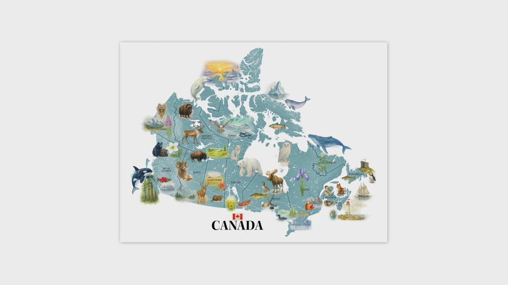 Perfect as art for your living room, kid's bedroom, office of cottage this Canadian map is fun, educational and decorative. It makes a thoughtful gift for Canadians, travellers or anyone who loves nature and geography.