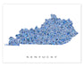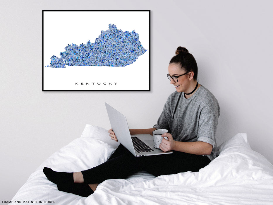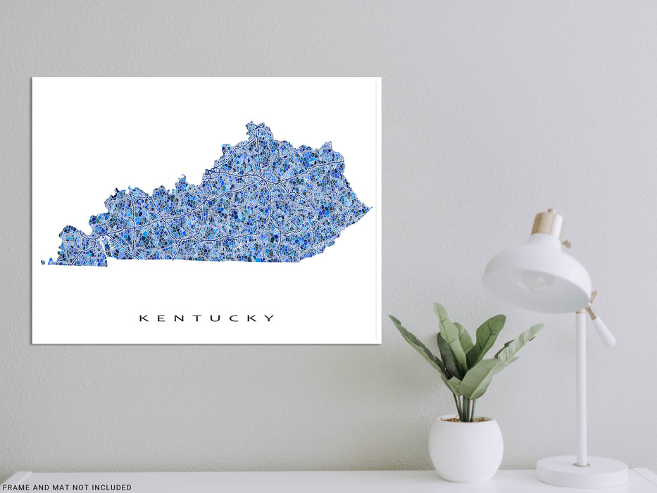 This Kentucky state map art print features an intricate design with main roads, water features, and almost 4,000 blue shapes mosaicked into a 'stained glass style'. Perfect for adding a modern and interesting touch to your living spaces and office, this map print celebrates your love of Kentucky. Available in various sizes, from small print to poster.