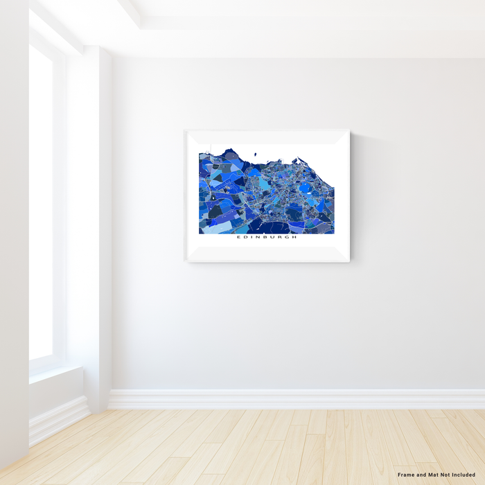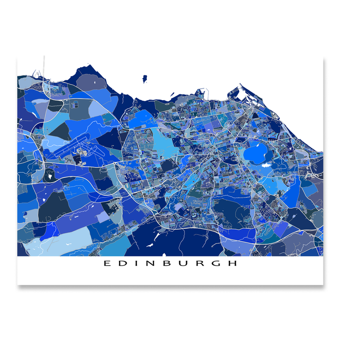 Celebrate Edinburgh, Scotland with this modern and interesting map print! Featuring city streets, water features, and thousands of blue shapes, this print adds a uniquely detailed design to your living spaces and office. Available in various sizes, from small prints to posters.