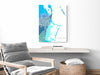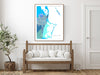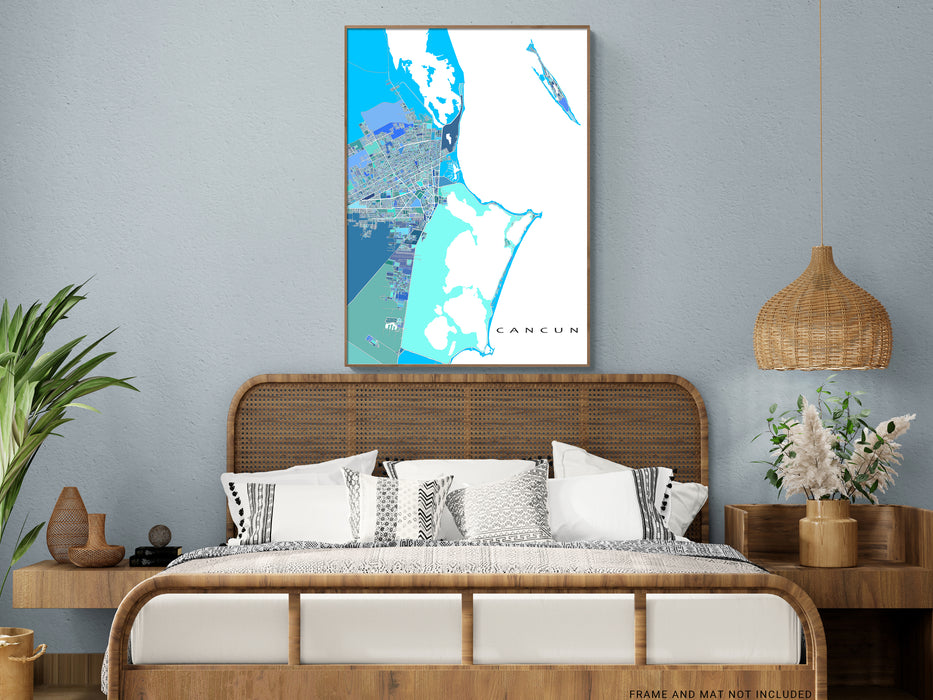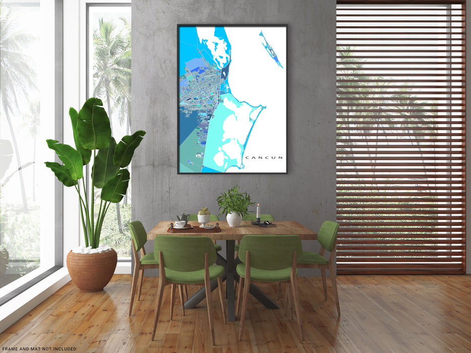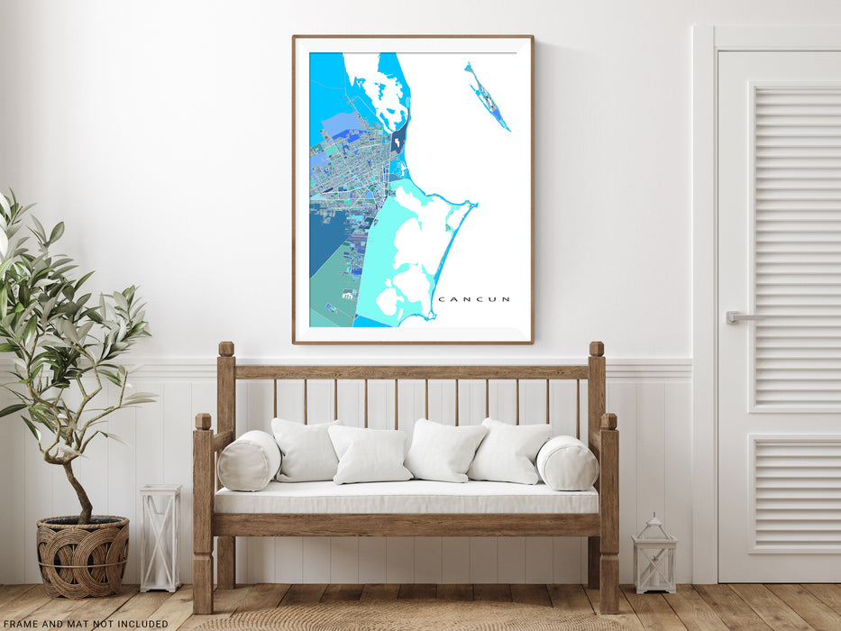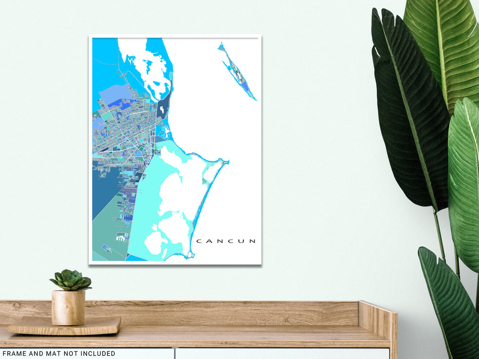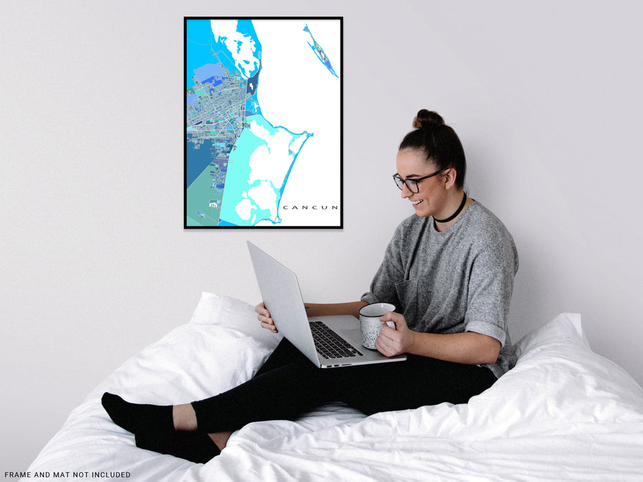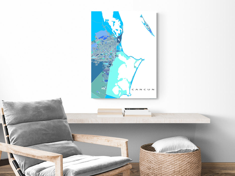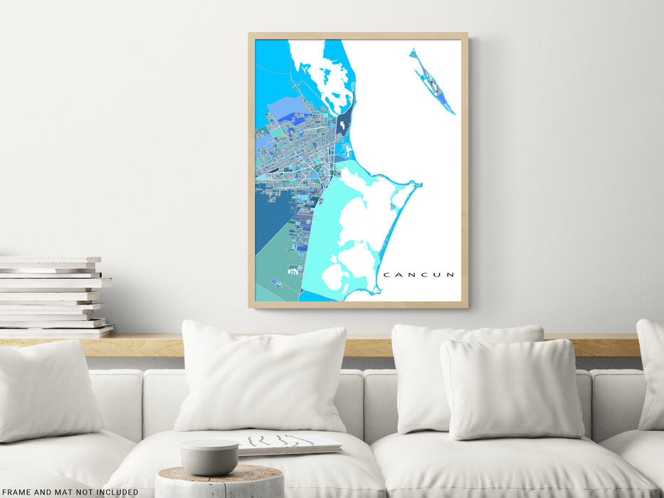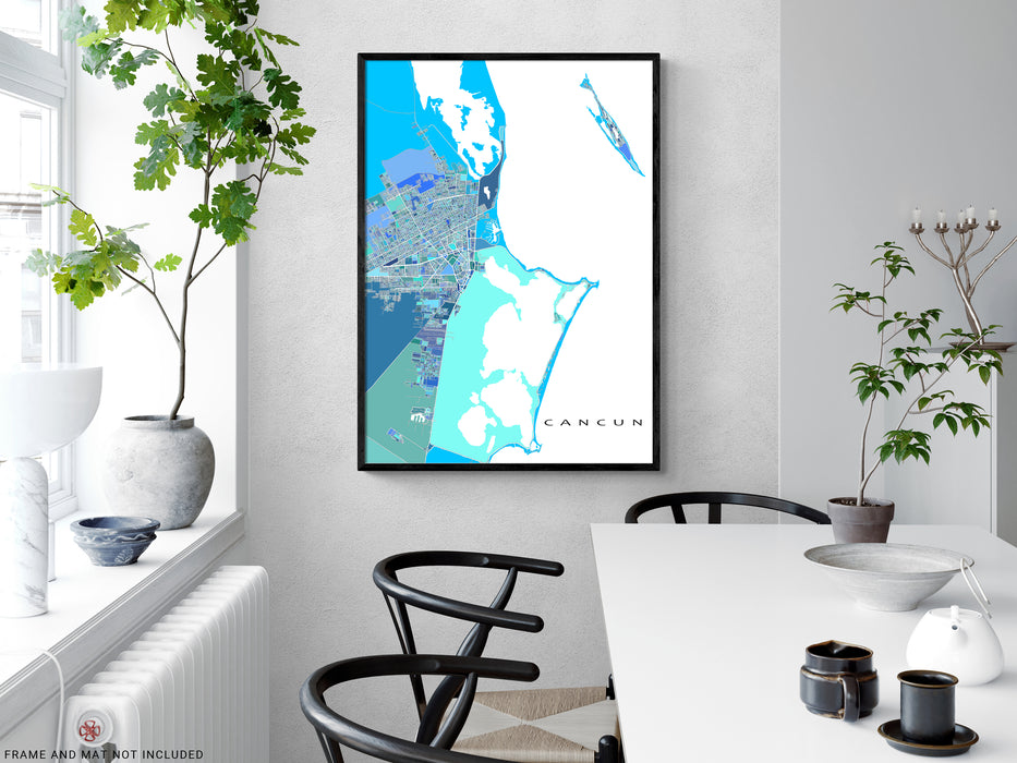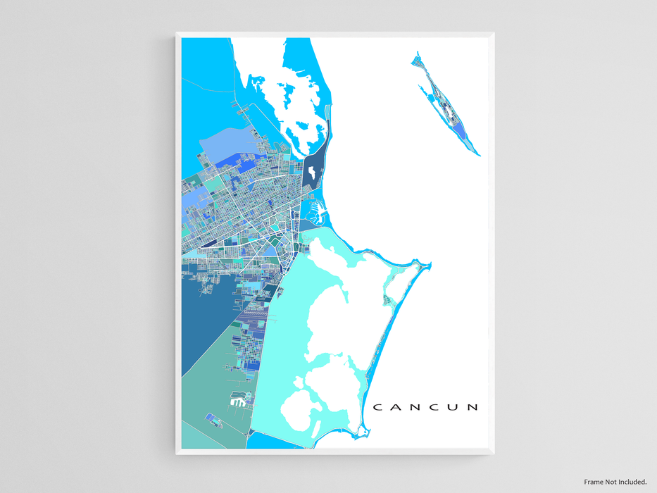 Discover the intricate design of Cancun with this map print, showcasing city streets, water features, and a vibrant array of blue, aqua, and turquoise shapes. Includes Isla Mujeres for a complete overview of the region. Add a touch of modernity and interest to any living space or office with this unique print. Available in various sizes, from print to large poster.