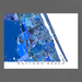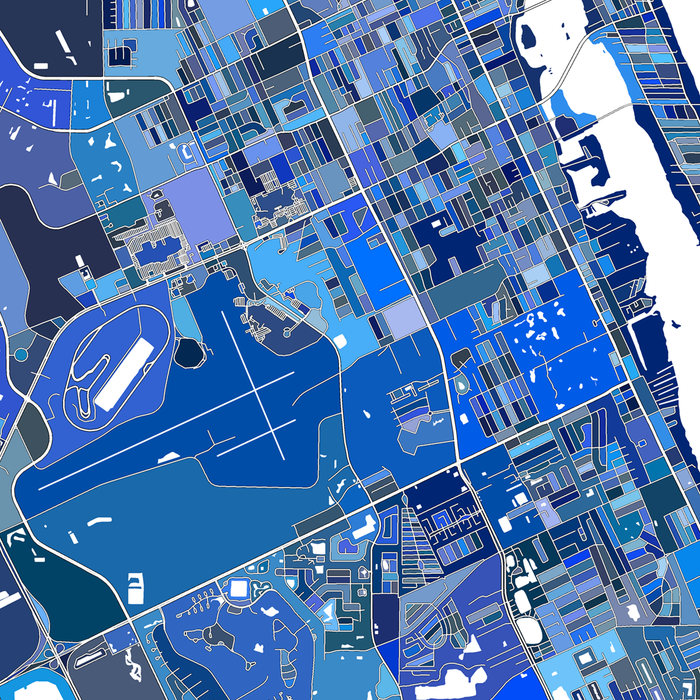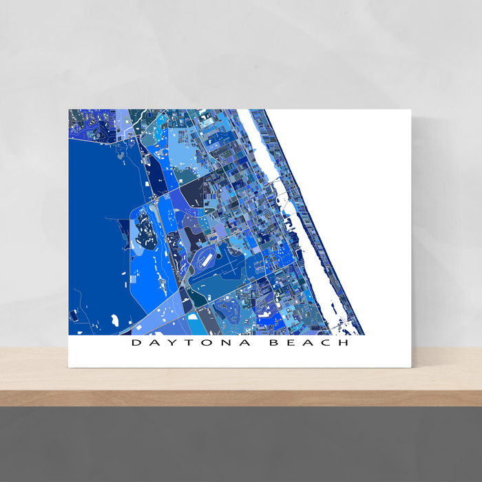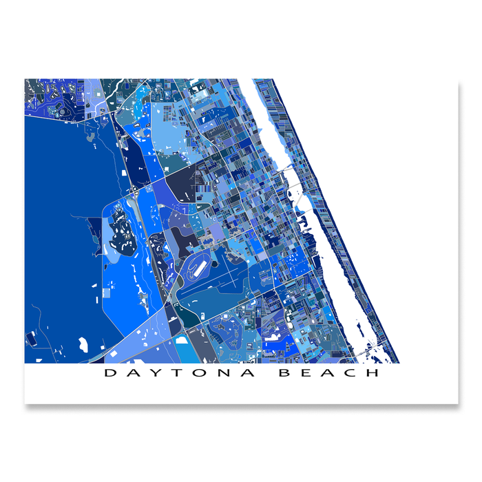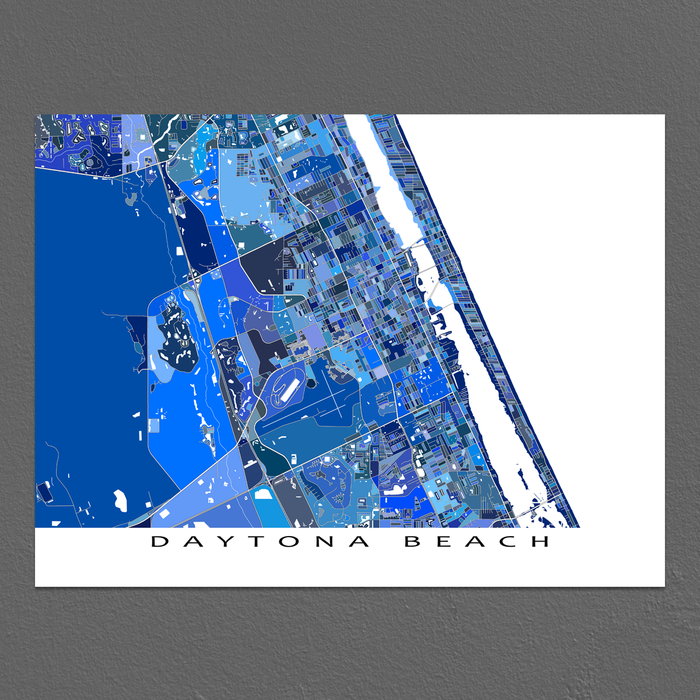 This unique map design of Daytona Beach, Florida (home of the Daytona International Speedway, NASCAR Daytona 500 race) features city streets, water features, and thousands of blue shapes.