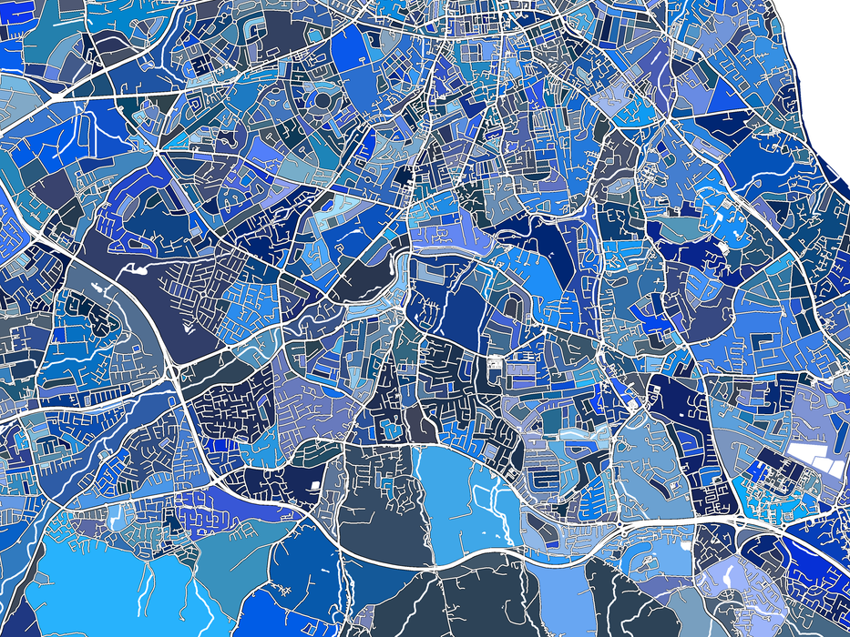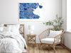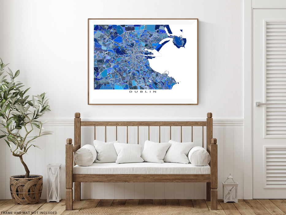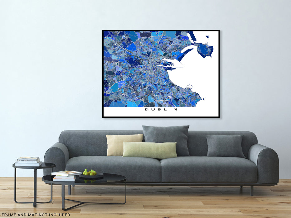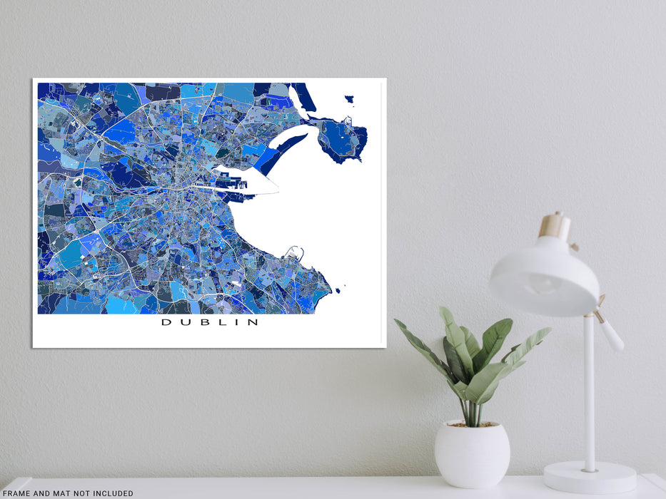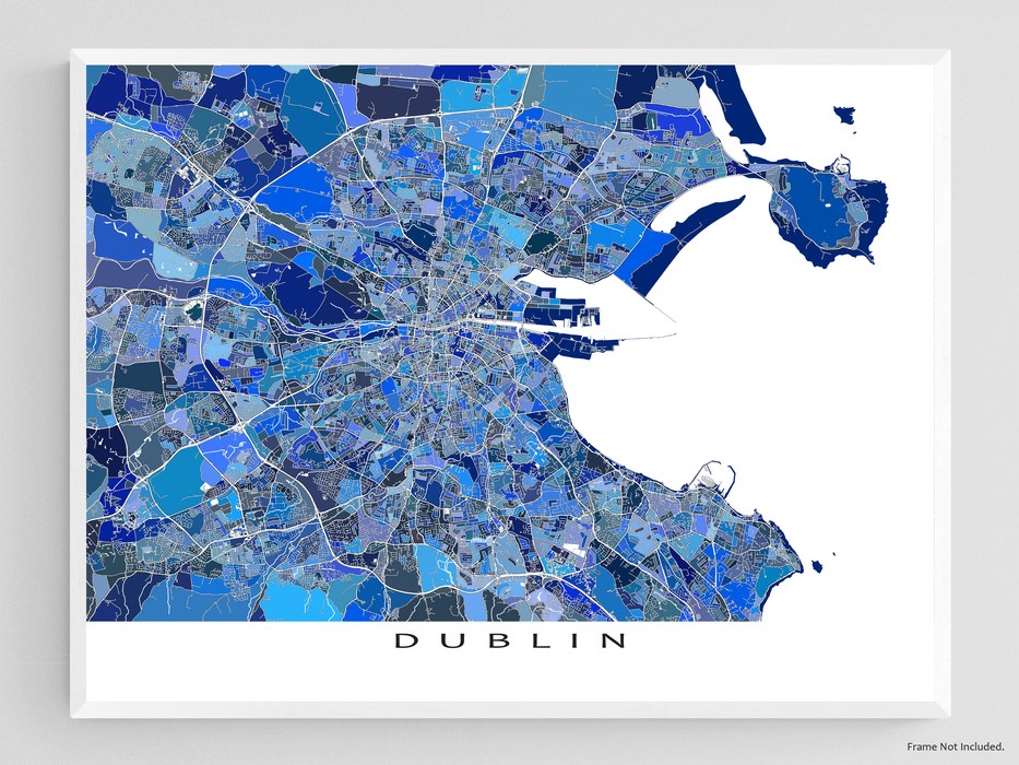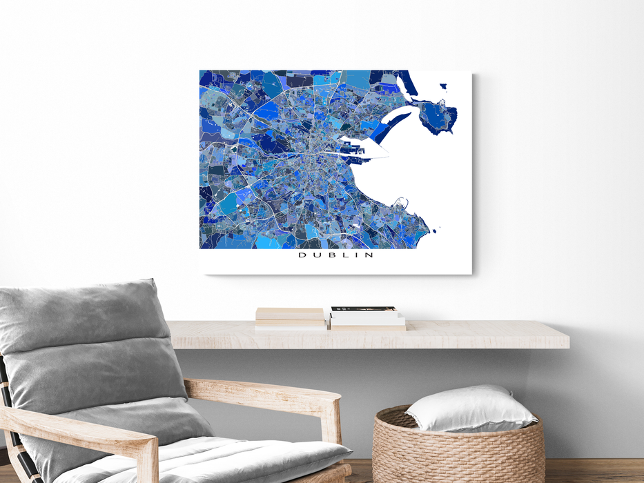 A modern map design of Dublin, Republic of Ireland, with intricate detail and appealing blue hues. City streets, waterways and thousands of shapes create a unique look and style. Perfect for any abode or workspace, the Dublin Map Print brings charm and life to any room. Widely available in various sizes, from print to large poster. Celebrate your love of Dublin!