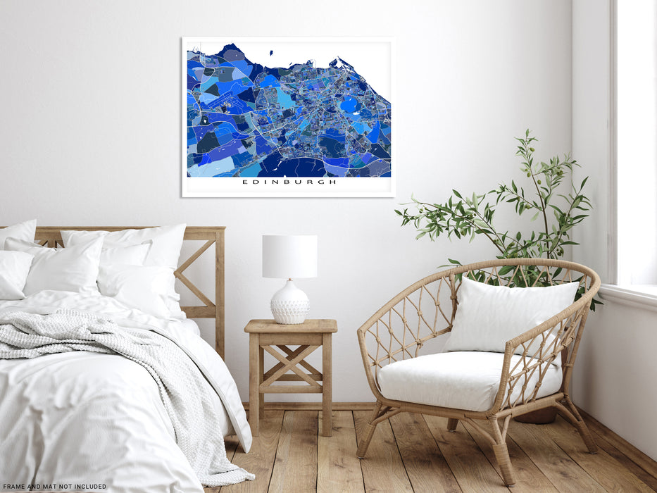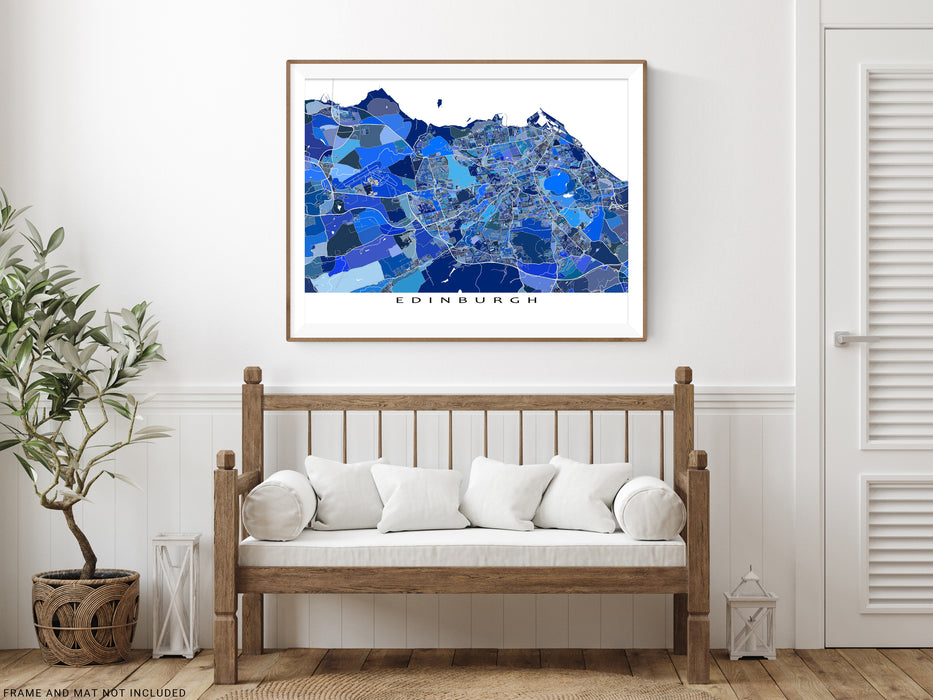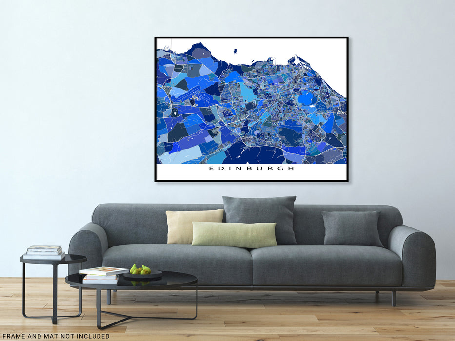 Celebrate Edinburgh, Scotland with this modern and interesting map print! Featuring city streets, water features, and thousands of blue shapes, this print adds a uniquely detailed design to your living spaces and office. Available in various sizes, from small prints to posters.