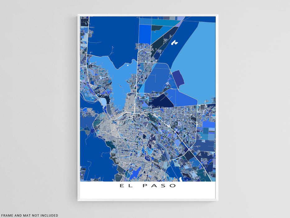 Discover the vibrant city of El Paso, TX with this unique map art print. With intricate details of city streets, water features, and thousands of blue shapes, this modern design will add a touch of interest to any living space or office. Available in a range of sizes from small prints to posters, celebrate your love for El Paso in style.