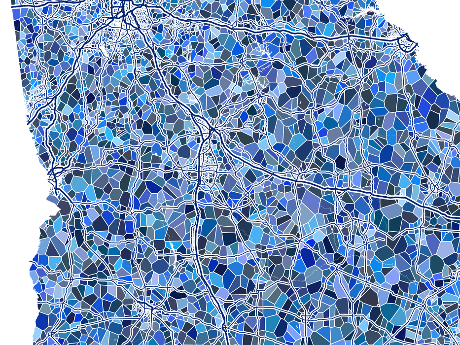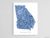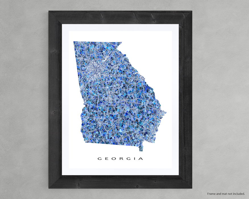 This Georgia map art print displays main roads, water features, and nearly 7,000 blue shapes arranged in a unique and intricate mosaic. Showcasing Georgia state in an eye-catching, modern design, the print is the perfect way to add an interesting and distinctive touch to your home or office. Presenting a range of sizes from prints to large posters, you can celebrate your love of Georgia with this statement piece.