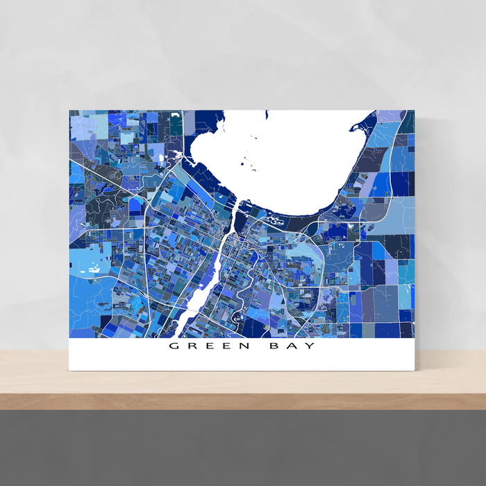 Uniquely detailed, this Green Bay map art print poster showcases the city's streets, water features, and thousands of blue shapes. It's a modern and interesting addition to any living or office space, celebrating your love for Green Bay, Wisconsin.
