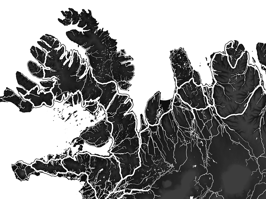 This Iceland wall map art print is a beautiful display of the natural landscape. Mountains, glaciers, plains, canyons, and shoreline are highlighted in the lightest coloured regions. Established roads and highways lead to larger cities, including the capital, Reykjavik.