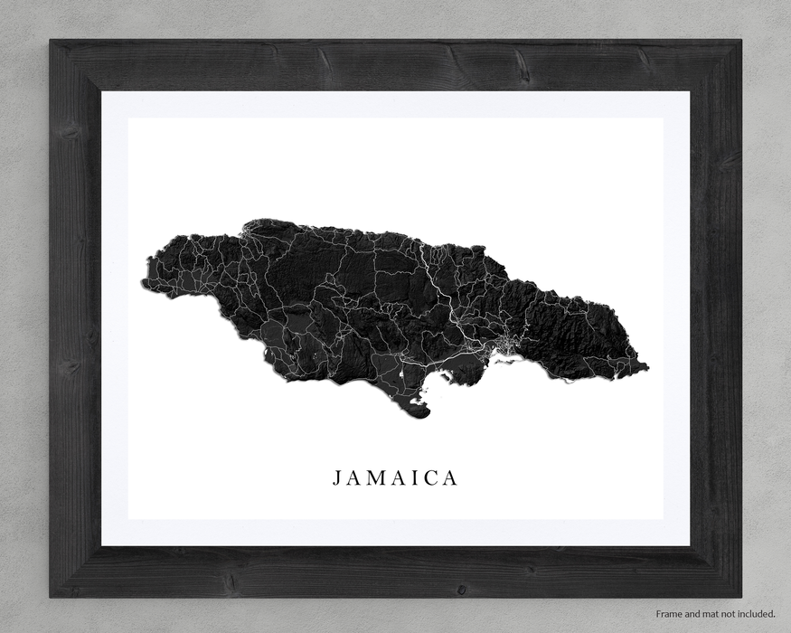 Jamaica map art print with black and white 3D topographic landscape features and main island roads.