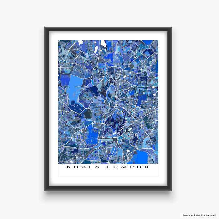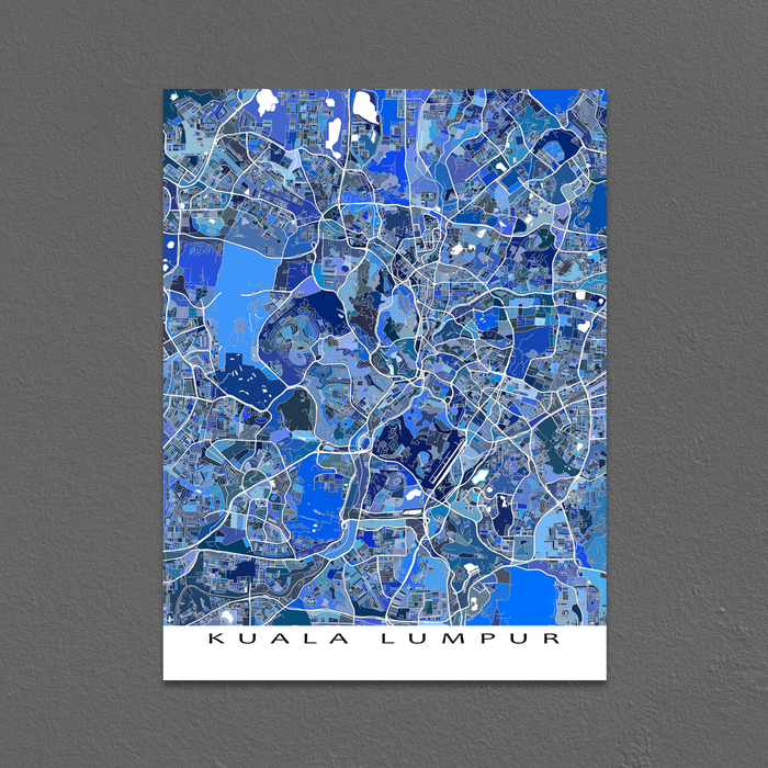 Discover the beauty of Kuala Lumpur, Malaysia with this map art print poster. Featuring city streets, water features, and an intricate design of blue shapes, this modern and eye-catching map will enhance any living or office space.