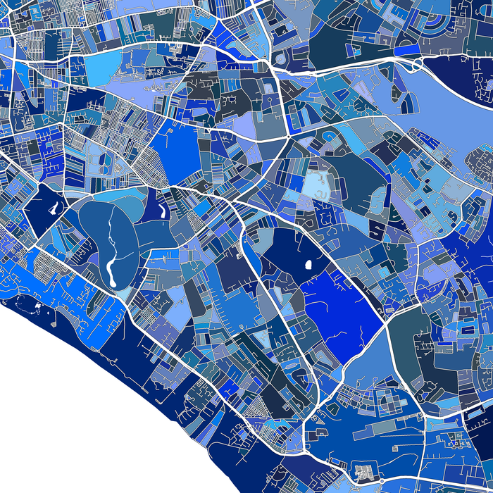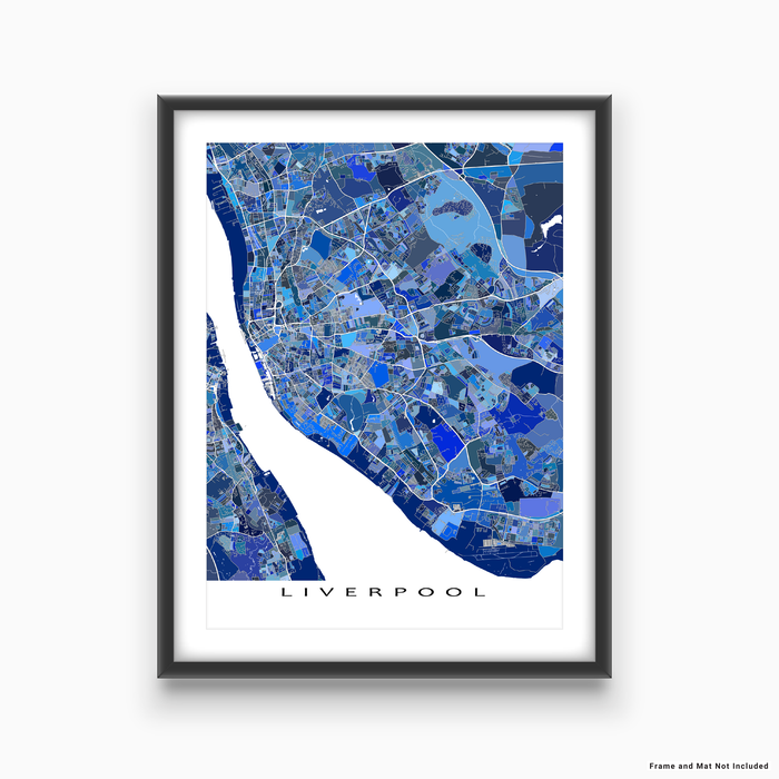 Uniquely detailed, this Liverpool, England, United Kingdom map print poster showcases the city's streets, water features, and thousands of blue shapes. Perfect for any living space or office, this modern and intriguing print celebrates your love for Liverpool. Available in various sizes, from small prints to large posters.