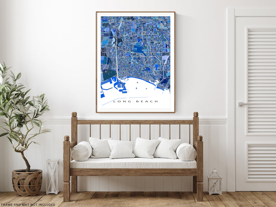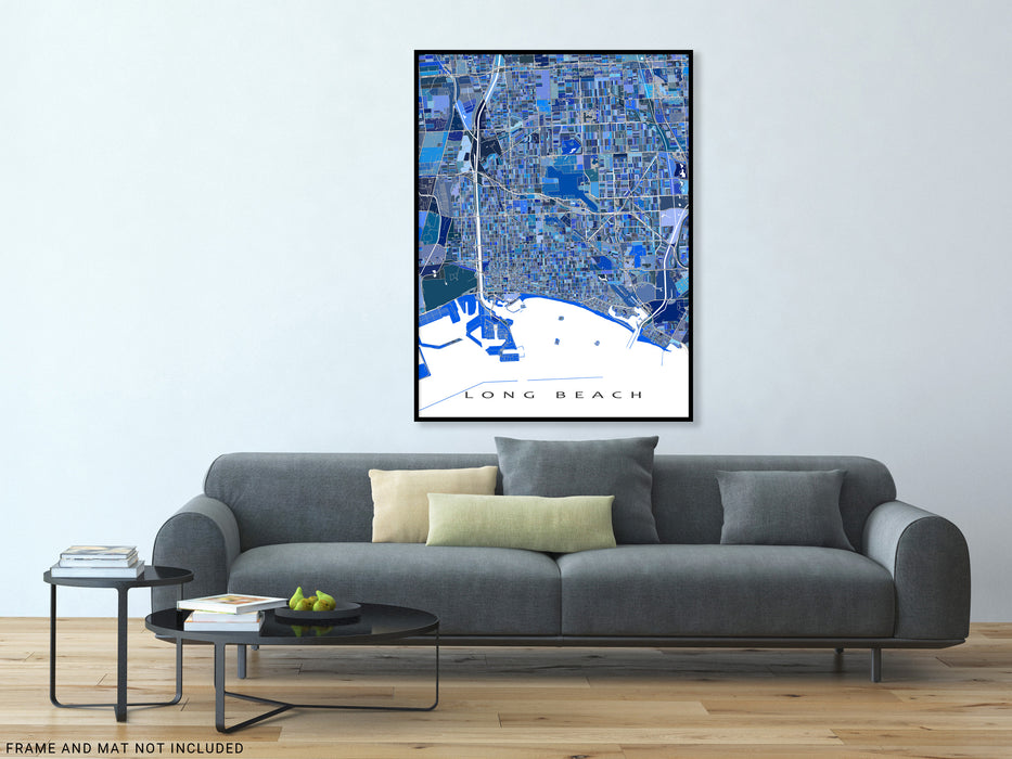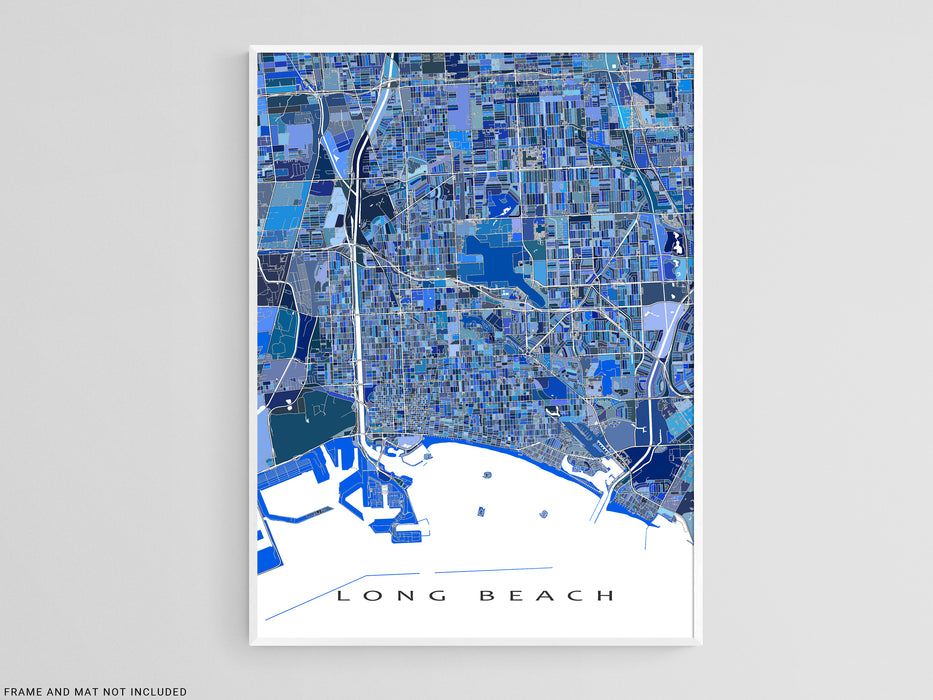 Discover the vibrant cityscape of Long Beach, California with our map art print poster. Featuring a combination of streets, water features, and blue shapes, this modern map design is the perfect addition to any living space or office.