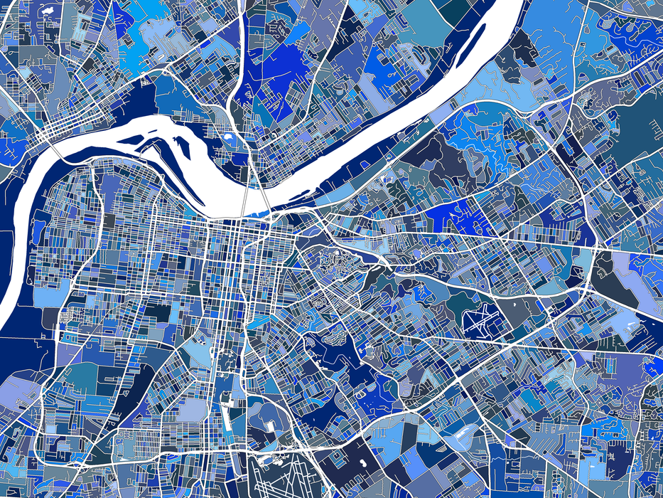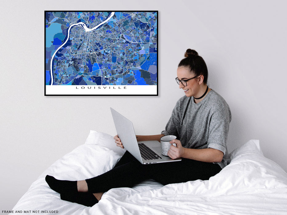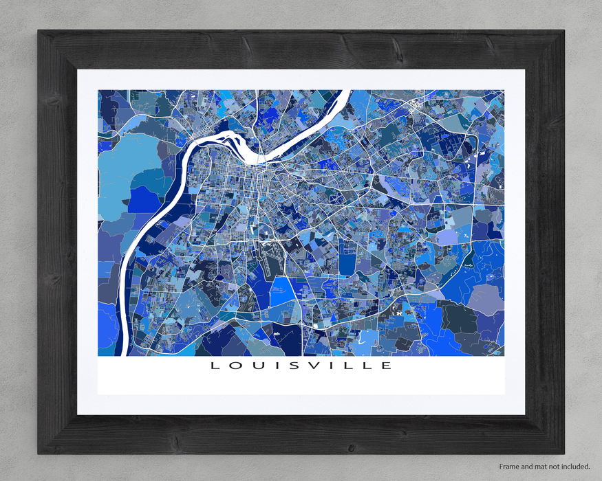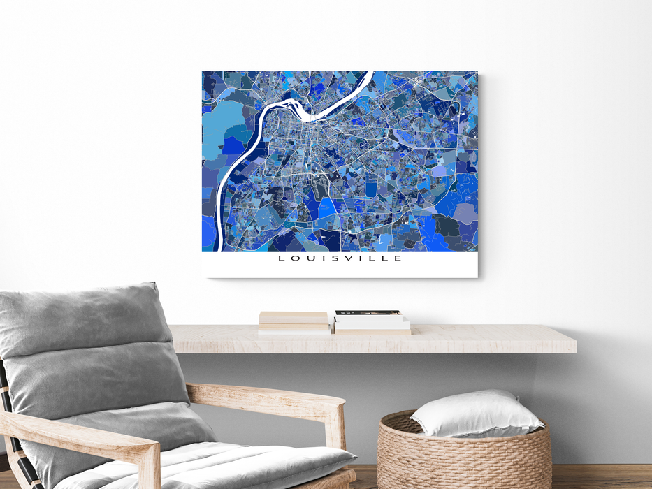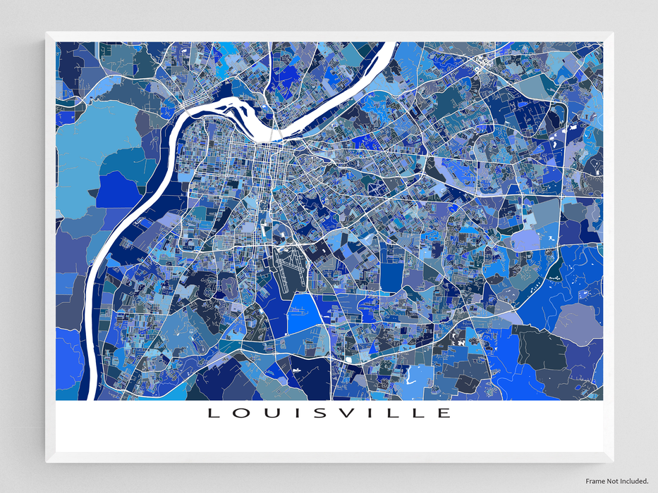 This Louisville map art print poster prominently features the city streets, water features and thousands of blue shapes - making a detailed map of Louisville Kentucky city. A modern, eye-catching addition to any home or office, this print celebrates the love of Louisville - and is available in a range of sizes from small print to large poster.