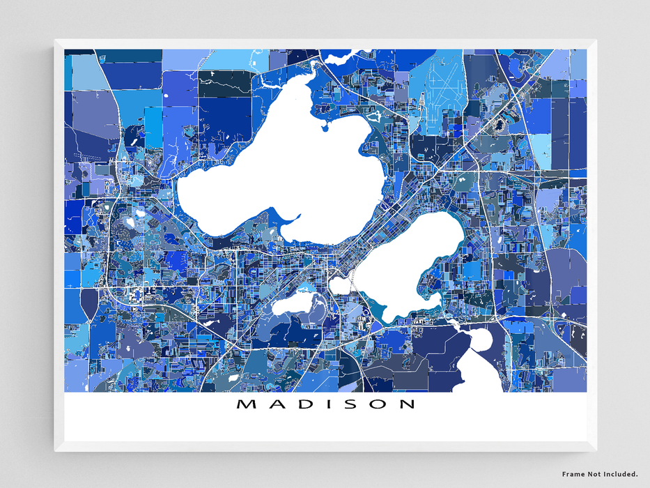Experience the city of Madison, Wisconsin in a whole new way with this modern and visually captivating art print. Featuring detailed maps of city streets, water features, and thousands of blue shapes, this print is a unique and stunning addition to any living space or office. Available in various sizes, from small prints to large posters.