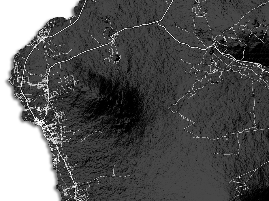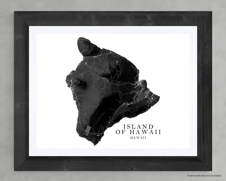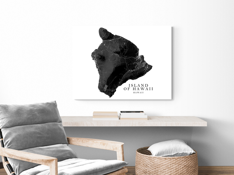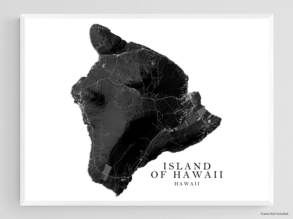 Island of Hawaii map art print with black and white 3D topographic landscape features and main Big Island roads.