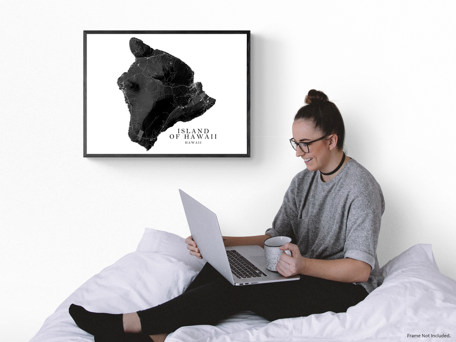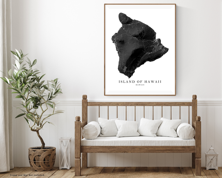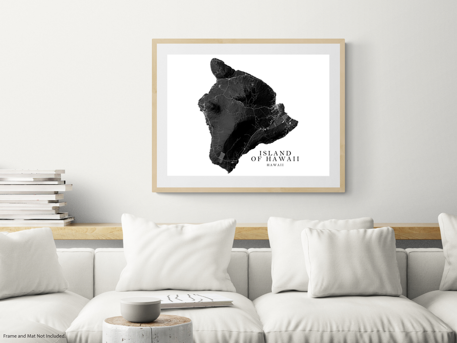Map of Hawaii Island Wall Art Print Poster, Black and White Topographic Hawaiian Islands Maps, Big Island Kona Hilo