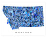 This Montana state map art print poster features main roads, water features, and over 1,500 blue shapes intricately assembled to create a unique 'stained glass style' design.