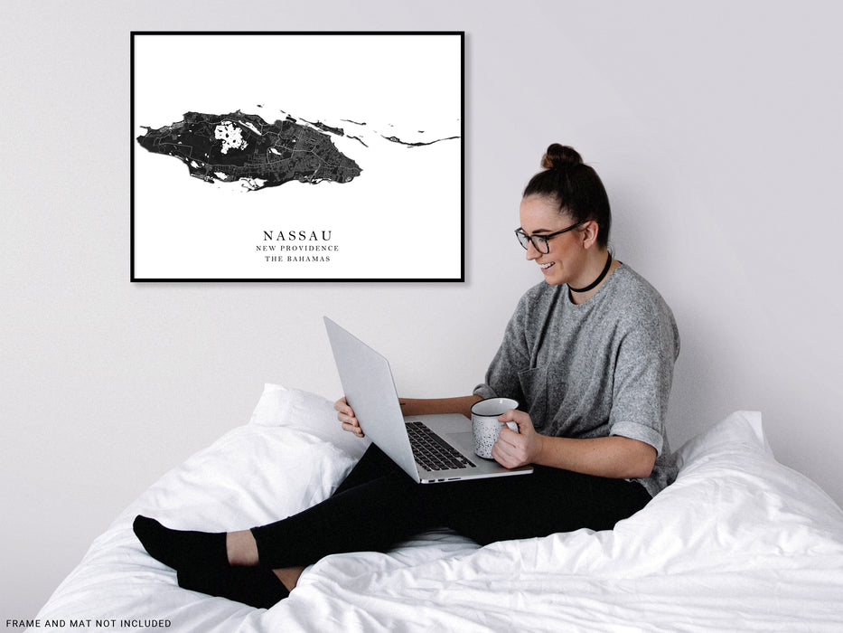Nassau Map Print Poster, Black and White Bahamas Islands Wall Art Prints, New Providence Island