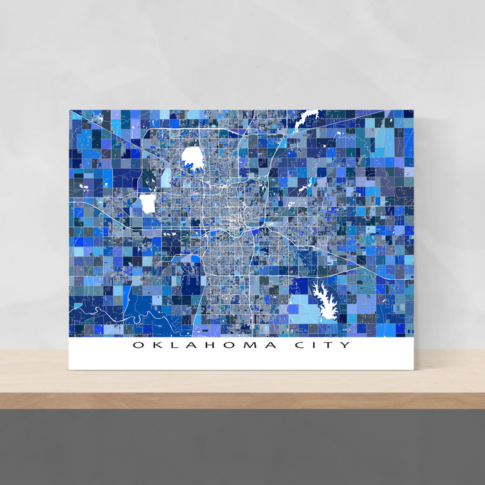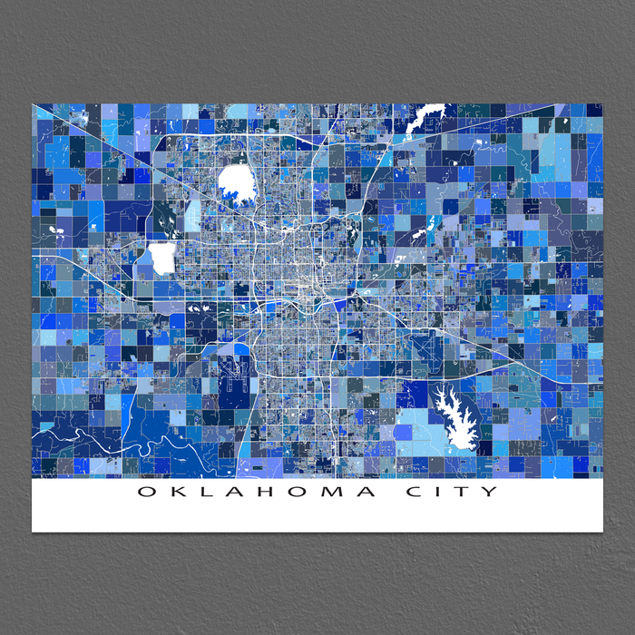 This Oklahoma City map print poster showcases the city's streets, water features and thousands of blue shapes in a uniquely detailed design. It's a modern and interesting addition to any living space or office, and perfect for those who love Oklahoma City, OK! Available in a variety of sizes, from small prints to large posters.