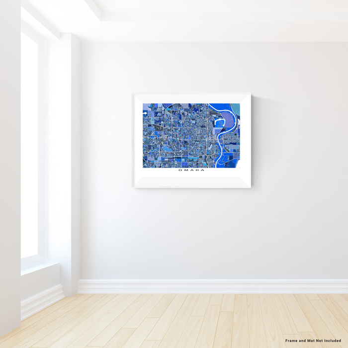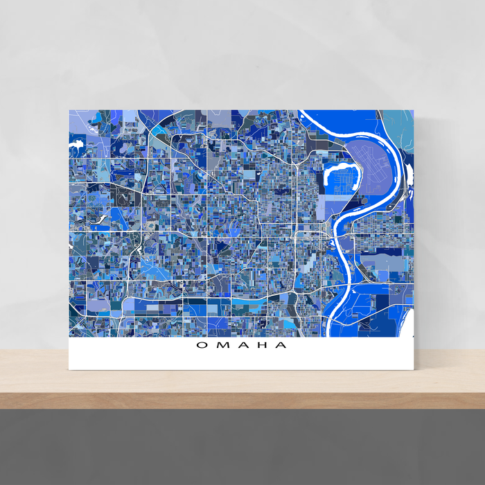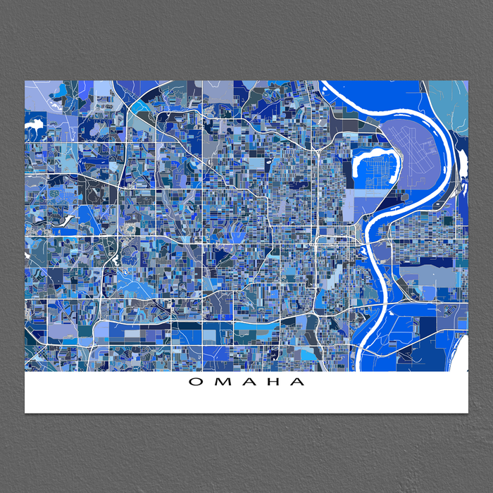Discover the charm of Omaha, Nebraska with this map art print poster. Featuring city streets, water features, and thousands of blue shapes, it's a modern and unique design that will add character to any room in your home or office. Choose from various sizes, from small print to large poster, and show your love for Omaha!