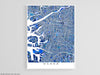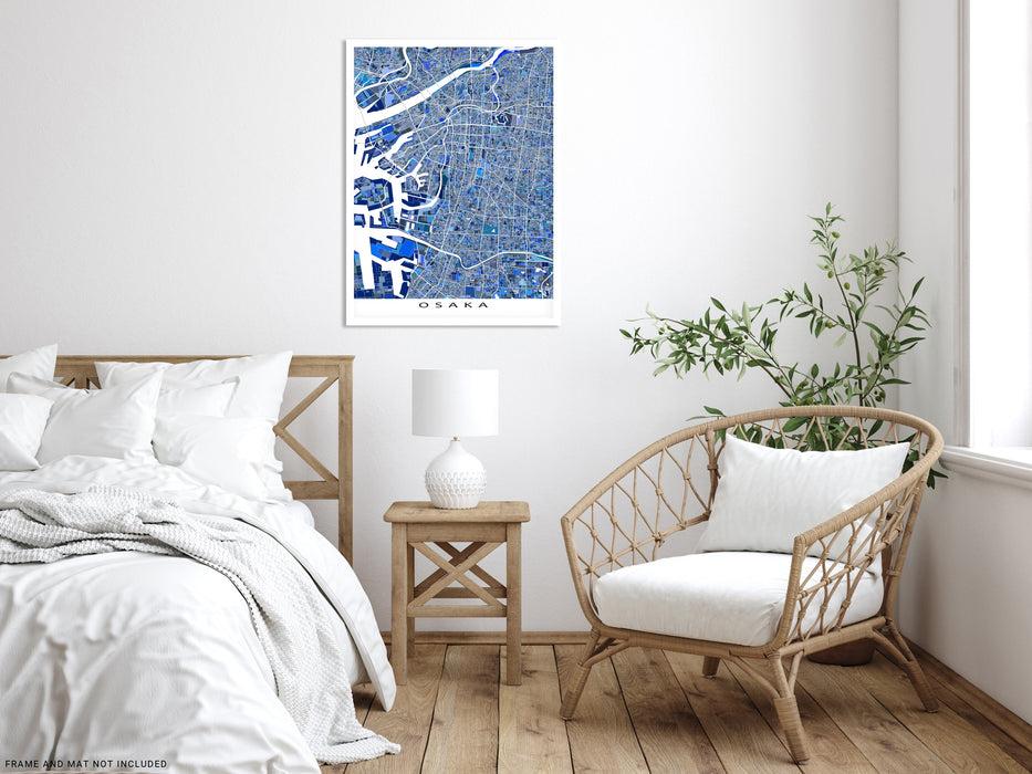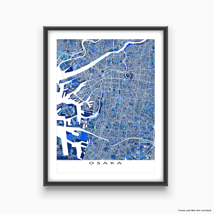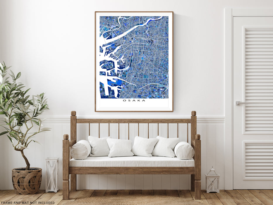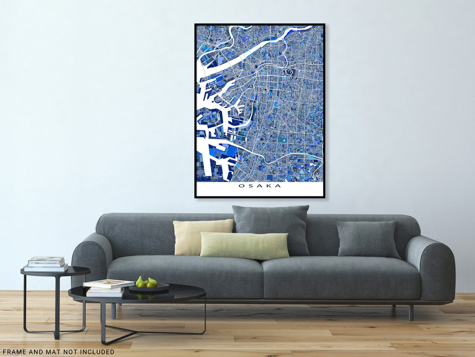 Osaka Japan City Street Map Wall Art Print Poster with Blue Geometric Design