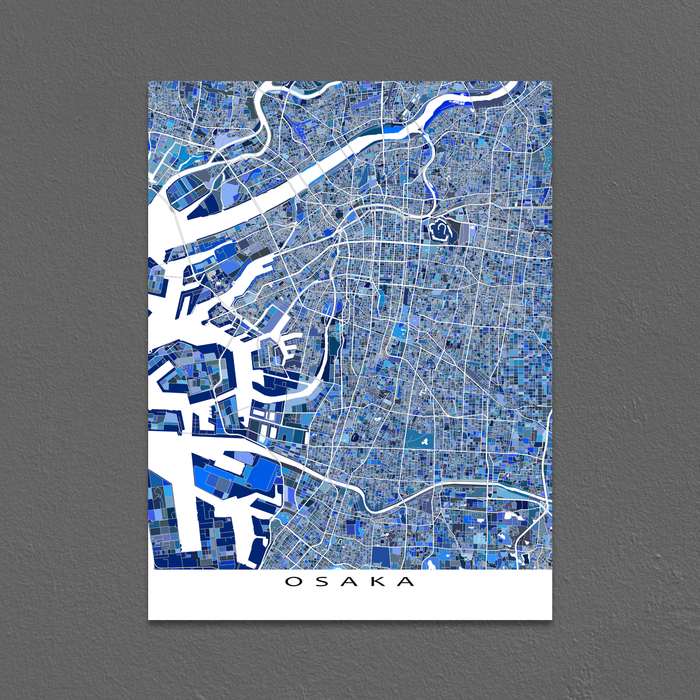 Embrace your love for Osaka with our map art print poster. From the city streets to water features, thousands of blue shapes form a detailed design of this unique city in Japan.