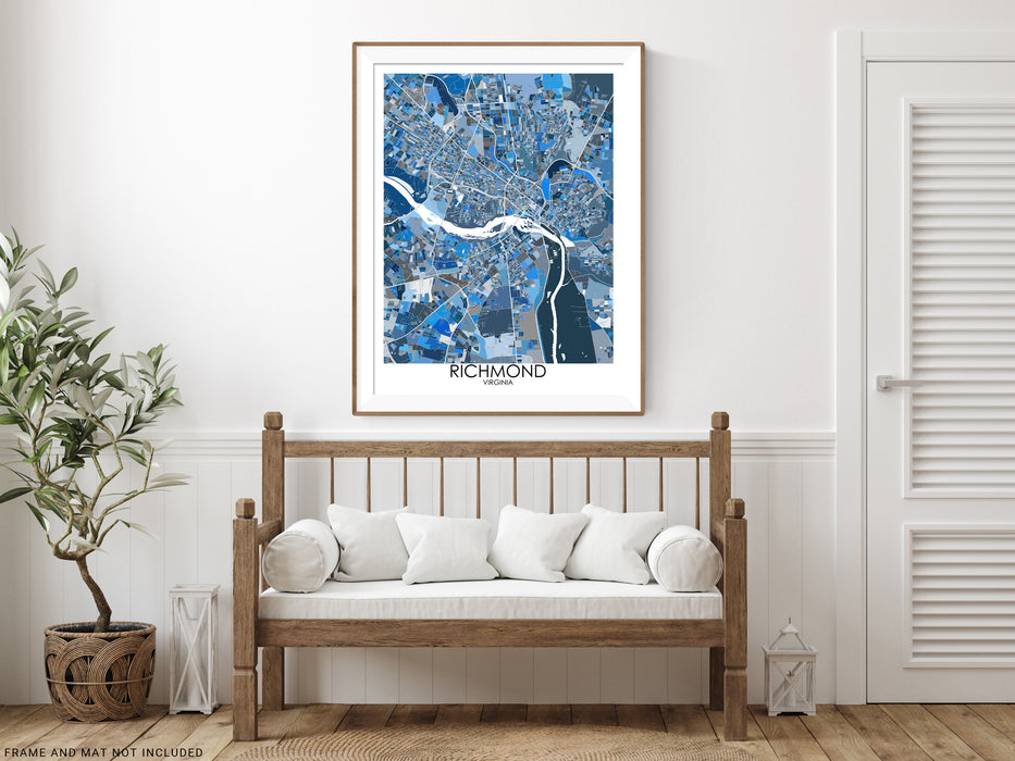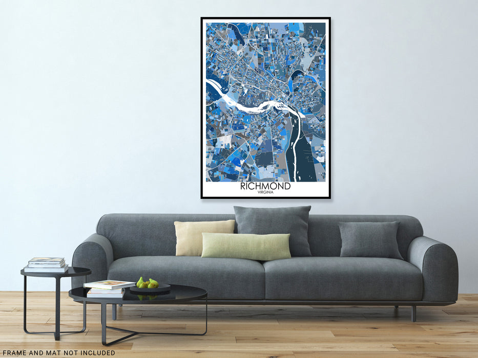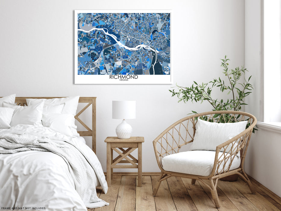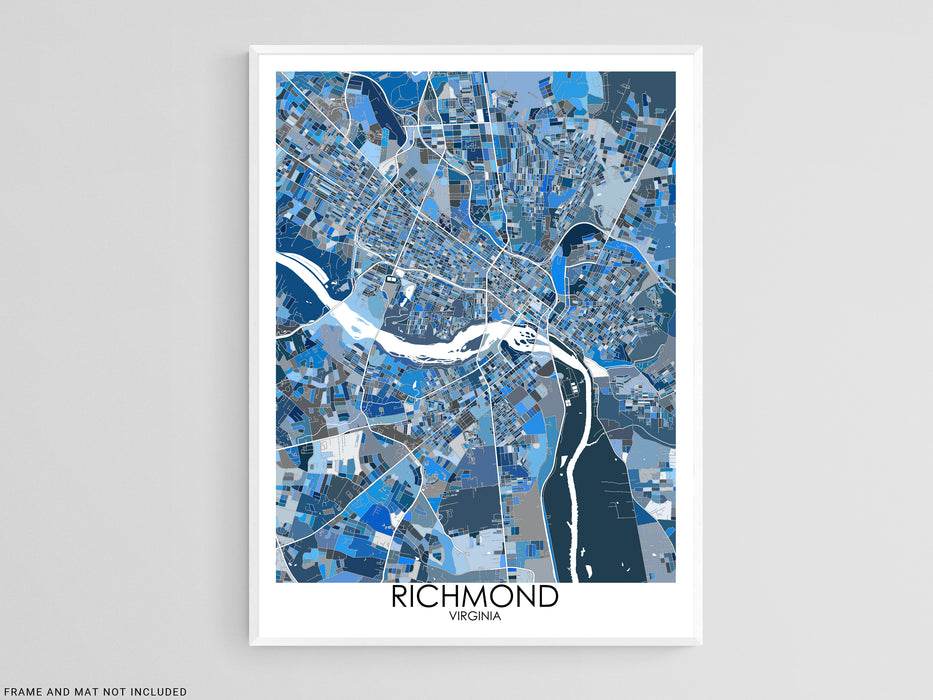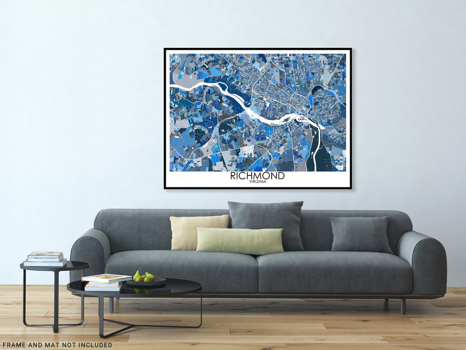 Richmond VA Map Wall Art Print Poster with Blue Geometric Abstract Design Decor, Virginia City Maps
