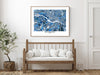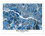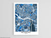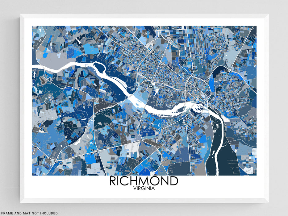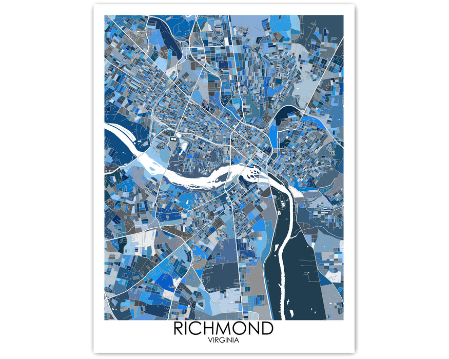 This Richmond, Virginia map art print poster showcases city streets, water features, and thousands of blue shapes, creating a uniquely detailed design.