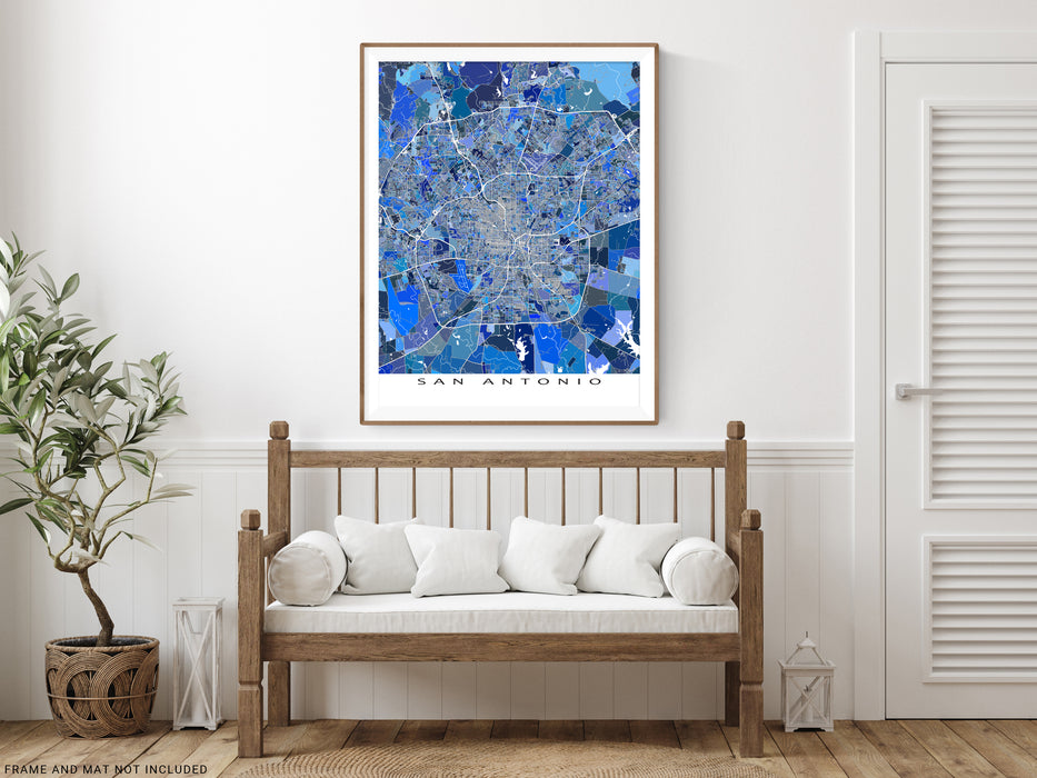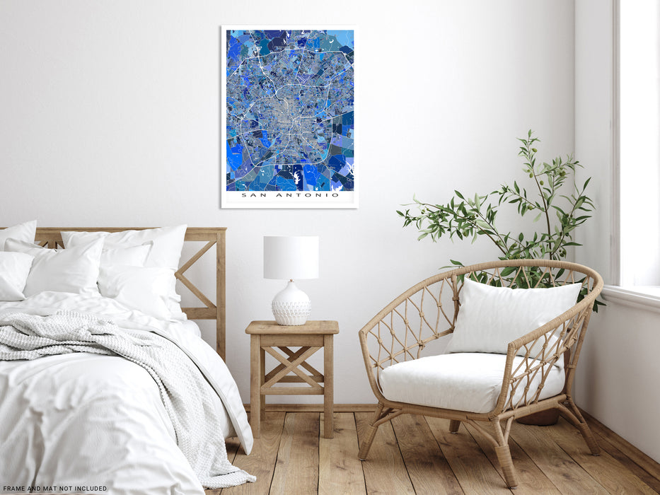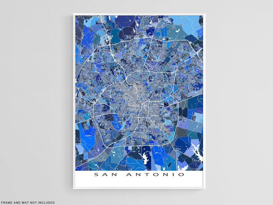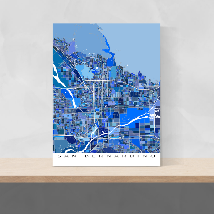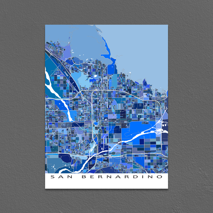 This map print poster showcases the intricate details of San Bernardino, California with its city streets, water features, and thousands of blue shapes. Perfect for any living space or office, this modern and unique design celebrates the beauty of this city. Available in a range of sizes from small prints to large posters.