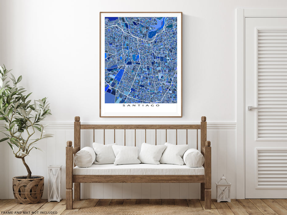 Santiago Chile City Street Map Wall Art Print Poster with Blue Geometric Design
