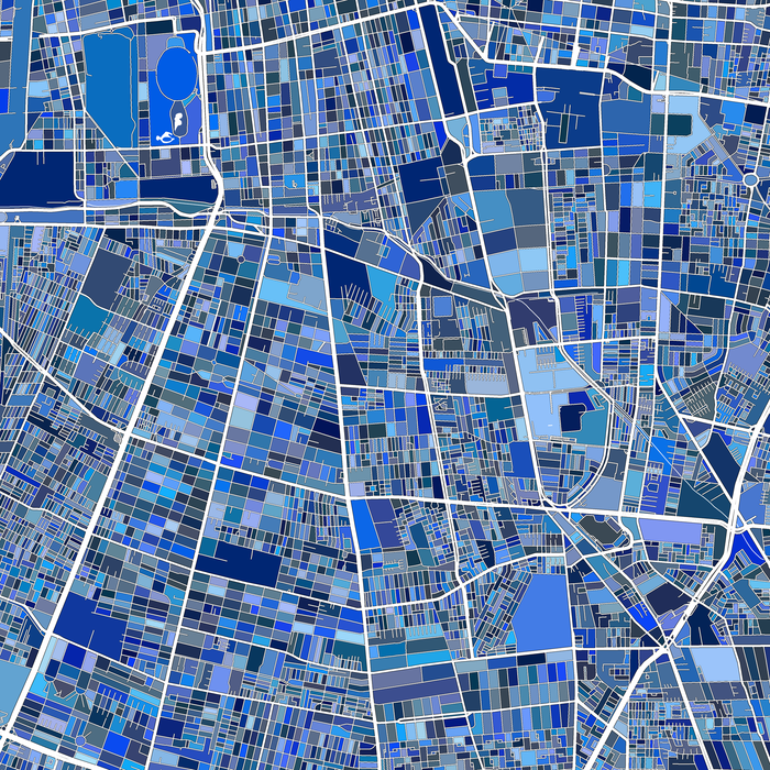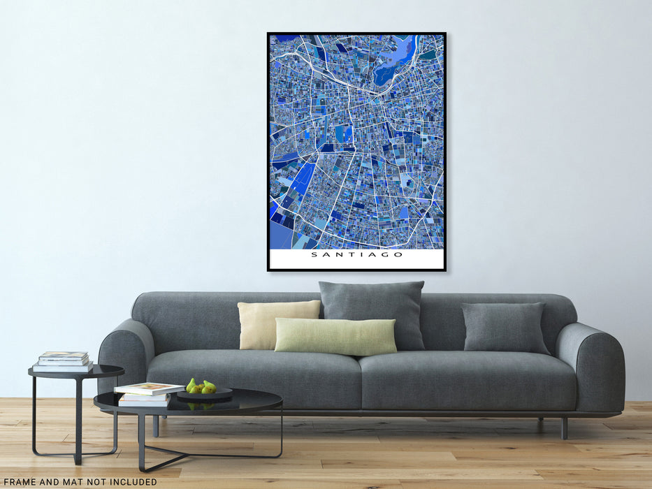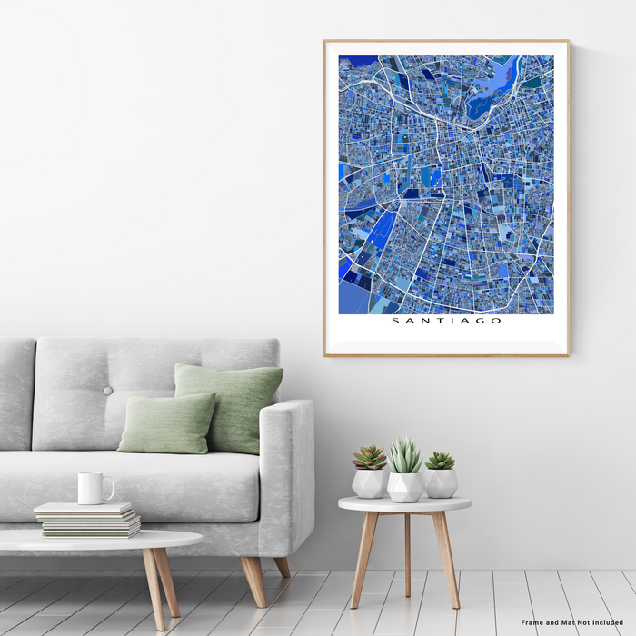 Discover the beauty of Santiago, Chile with this modern and intriguing map art print poster. Featuring city streets, water features, and thousands of blue shapes, this uniquely detailed design will add a noticeable touch to your living spaces and office. Celebrate your love for Santiago with this map, available in various sizes from small print to large poster.
