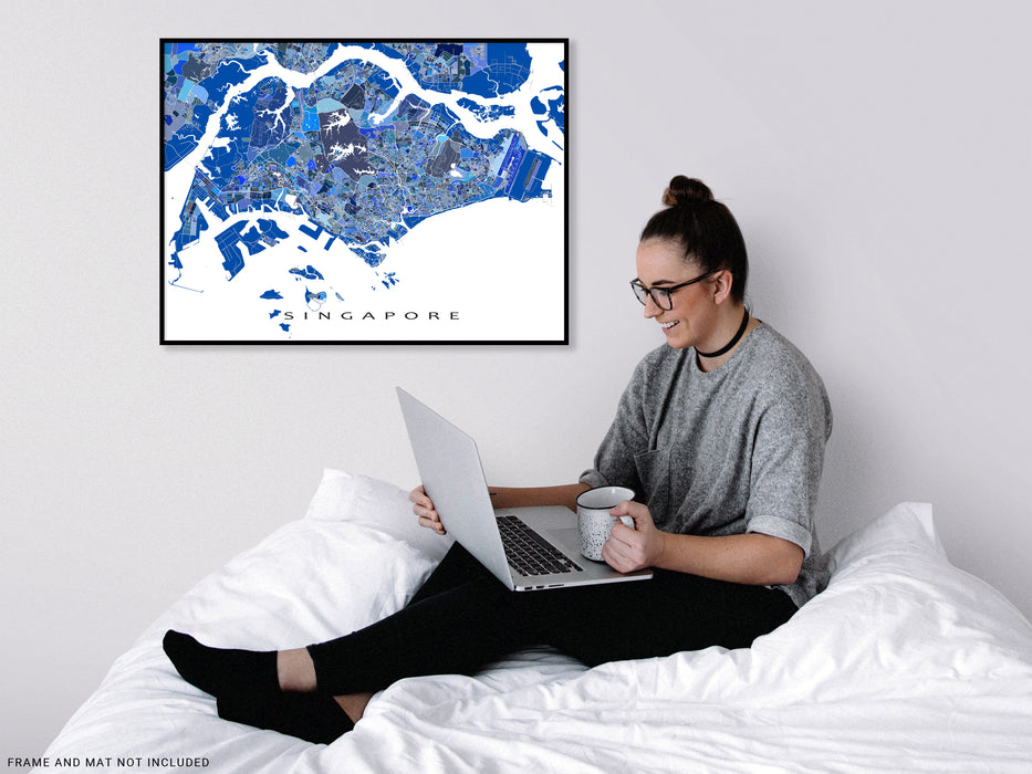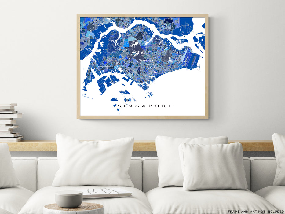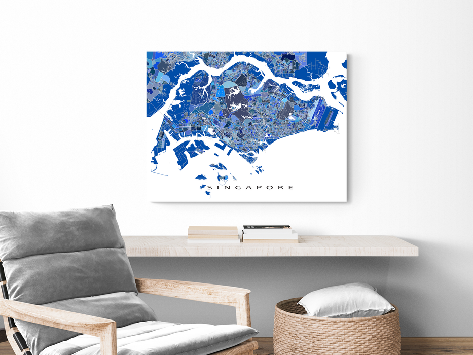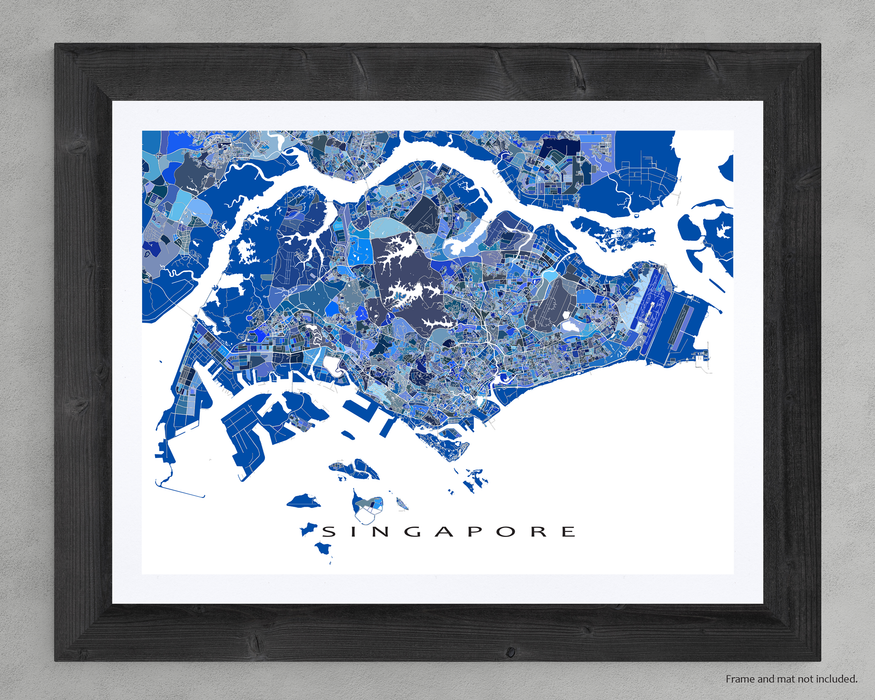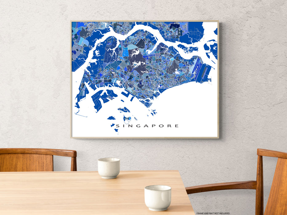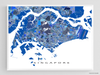 A unique map art print poster of Singapore, featuring detailed city streets, waterways and thousands of blue geometric shapes. This modern, eye-catching map design will add a unique touch of Singapore to any living or work space. Choose from various sizes ranging from small print to large poster.