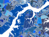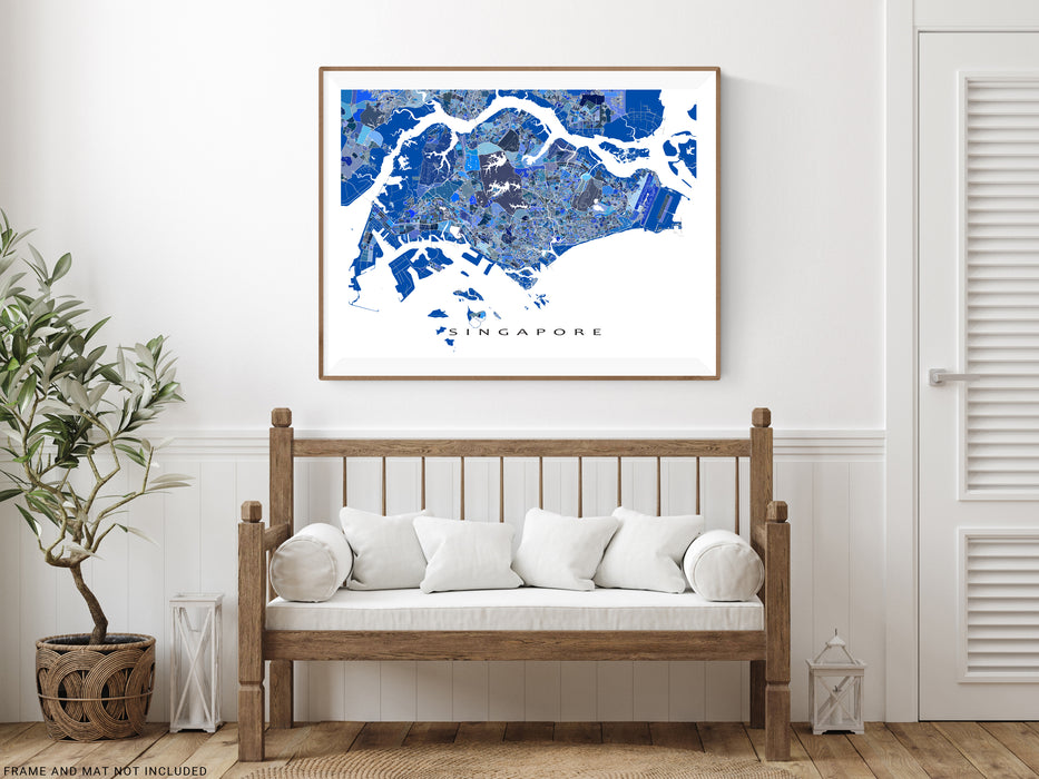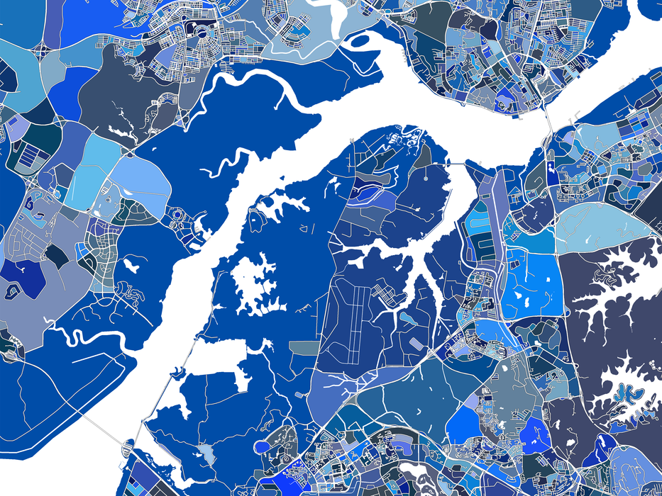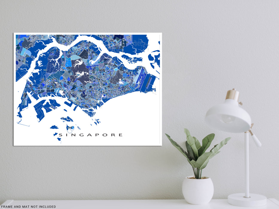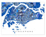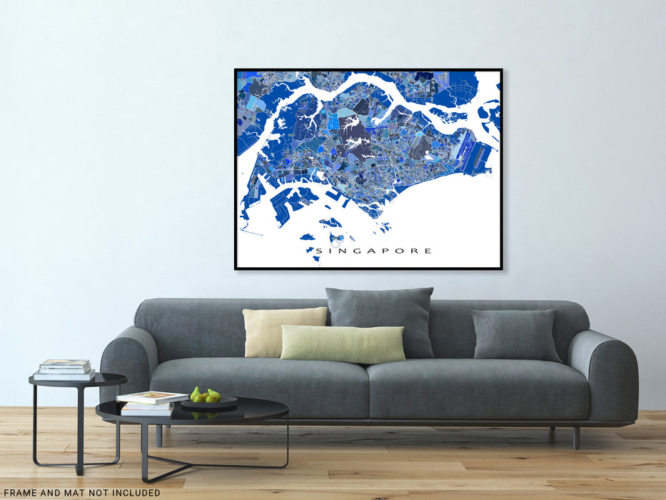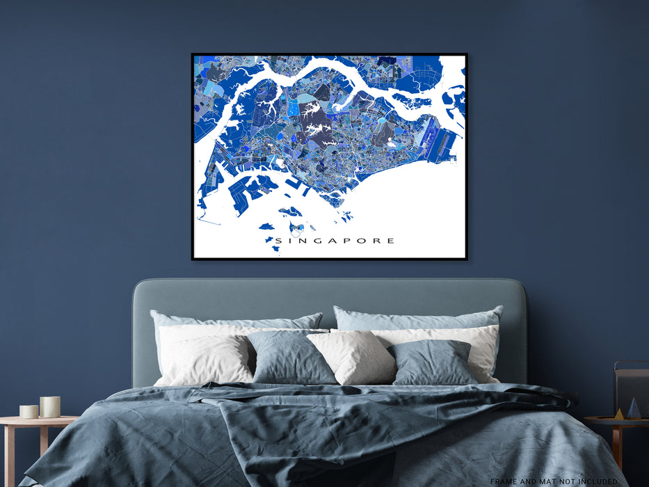 A unique map art print poster of Singapore, featuring detailed city streets, waterways and thousands of blue geometric shapes. This modern, eye-catching map design will add a unique touch of Singapore to any living or work space. Choose from various sizes ranging from small print to large poster.