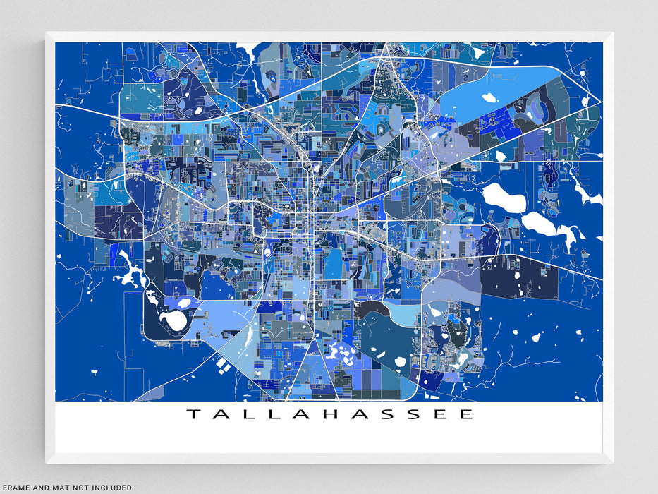 This Tallahassee, Florida map print poster showcases the city's streets, water features, and thousands of unique blue shapes, resulting in a modern and intriguing design. Perfect for decorating your home or office, this map celebrates your love for Tallahassee, FL.