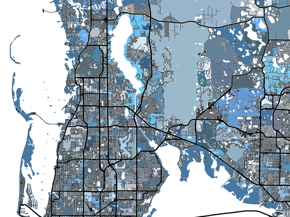 Tampa Bay region map art print poster featuring a denim blue, pale blue and grey geometric mosaic design and Tampa Bay area city streets/roads. Map print includes the cities of St. Petersburg, Tampa, Clearwater and Largo, Florida.