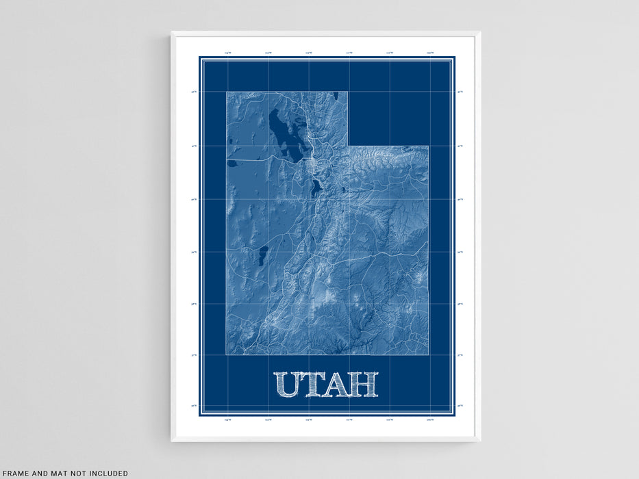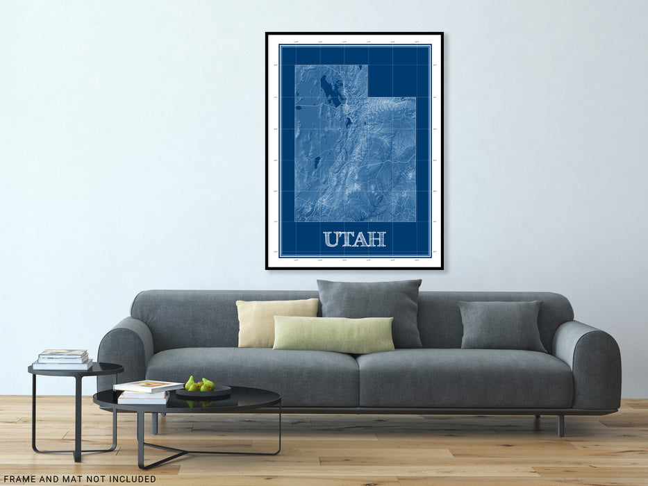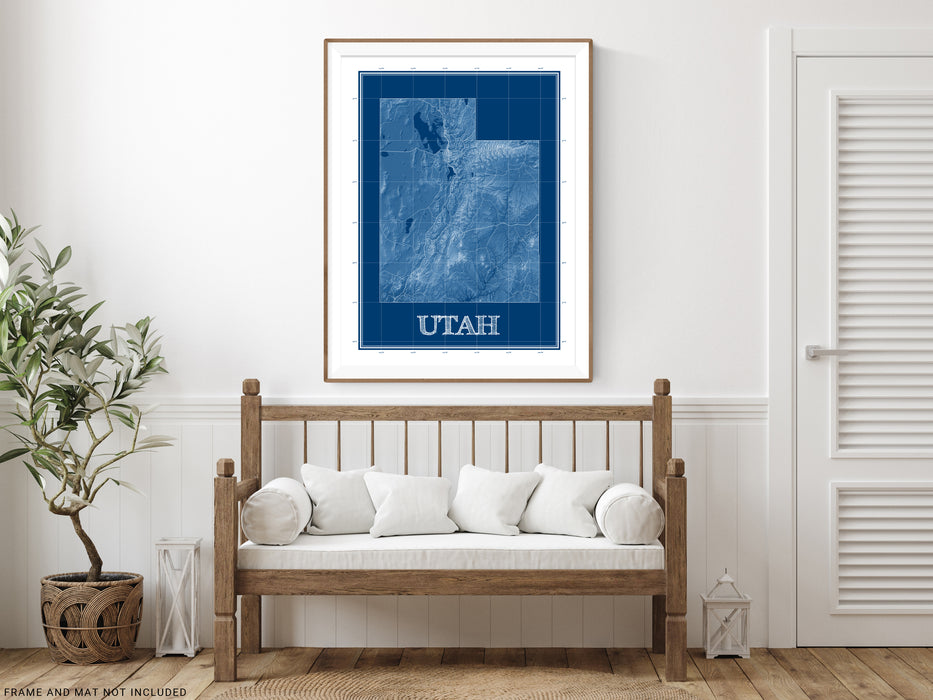 Utah State Topographic Map Wall Art Print Poster with Blue Patent Blueprint Design