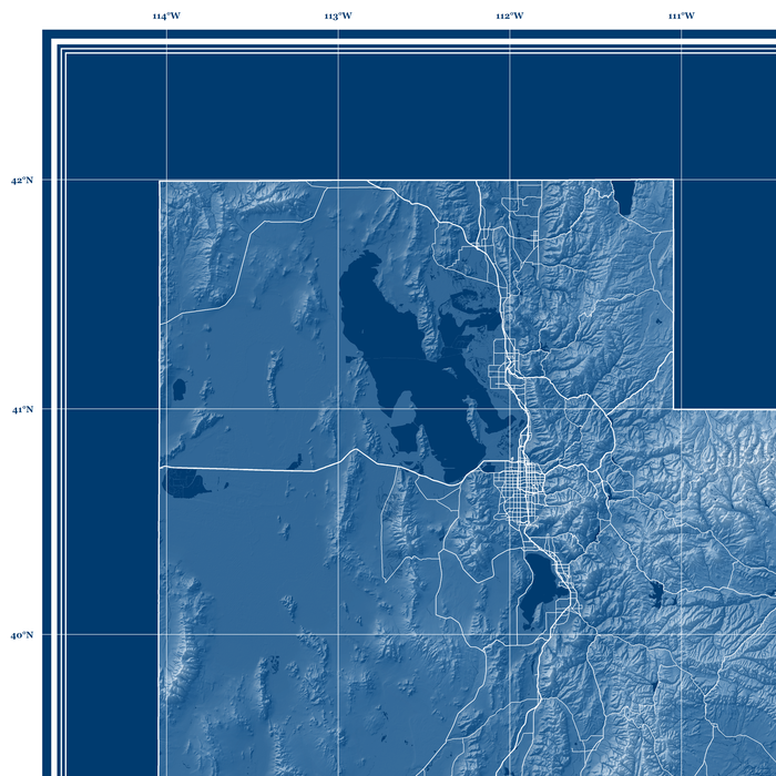 This blueprint-style Utah state map print poster showcases the streets, roads, and natural topographic landscape in a modern, eye-catching way.